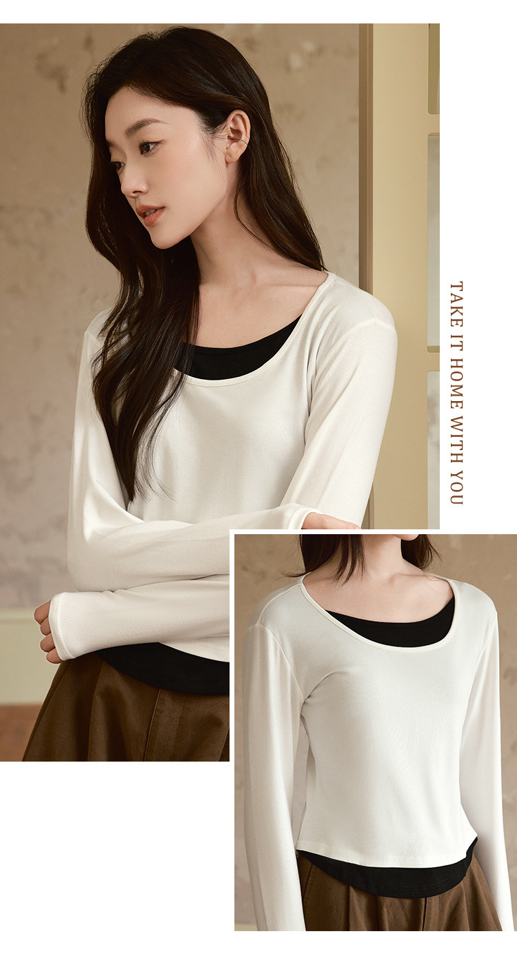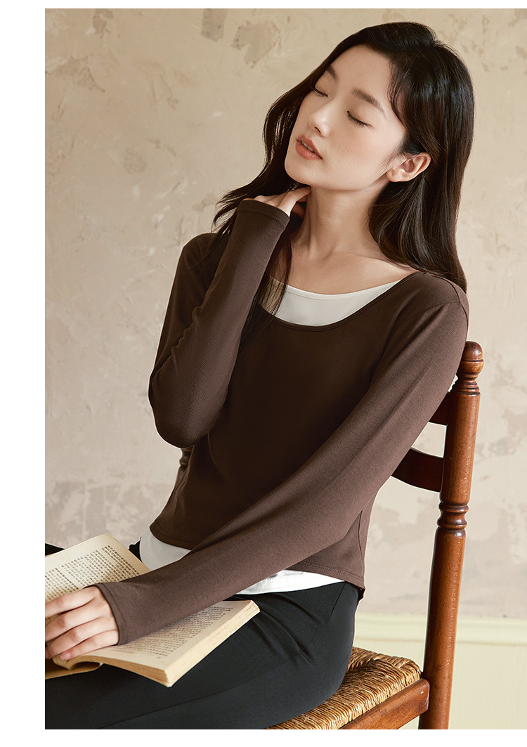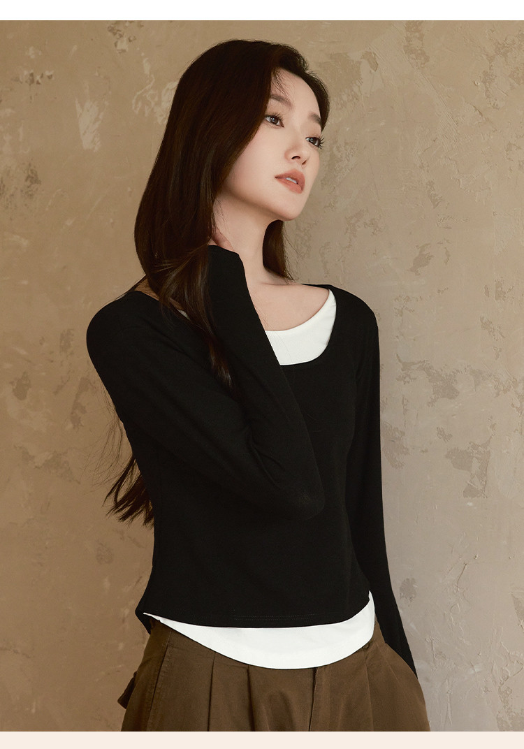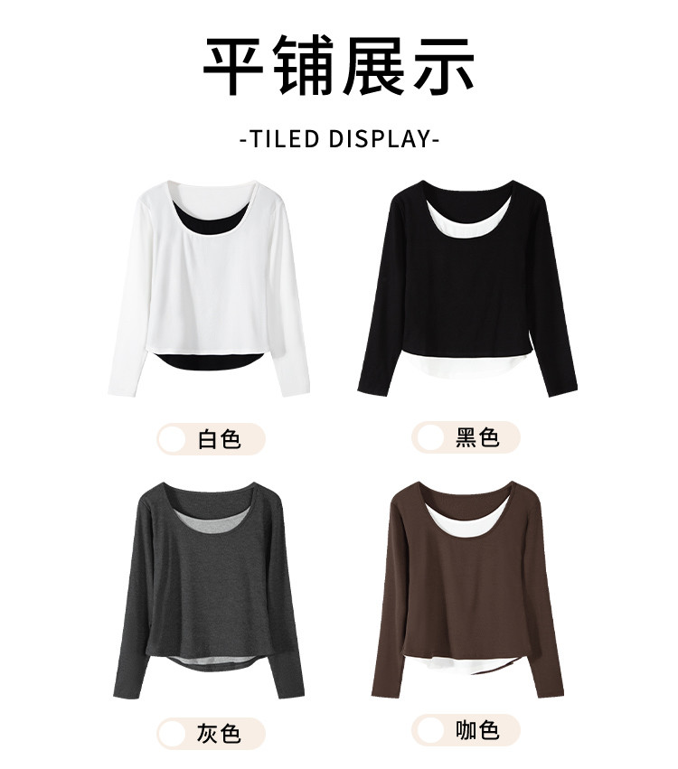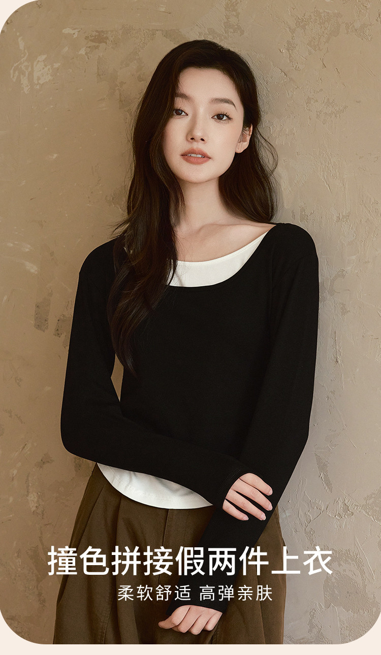 【桑蚕丝醋酸混纺】春秋设计感假两件撞色长袖小个子气质女式t恤 802561