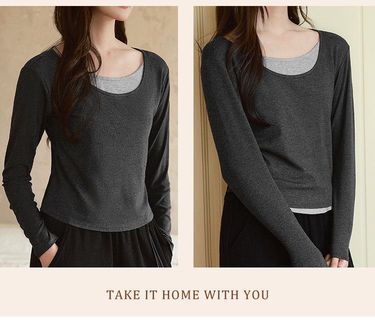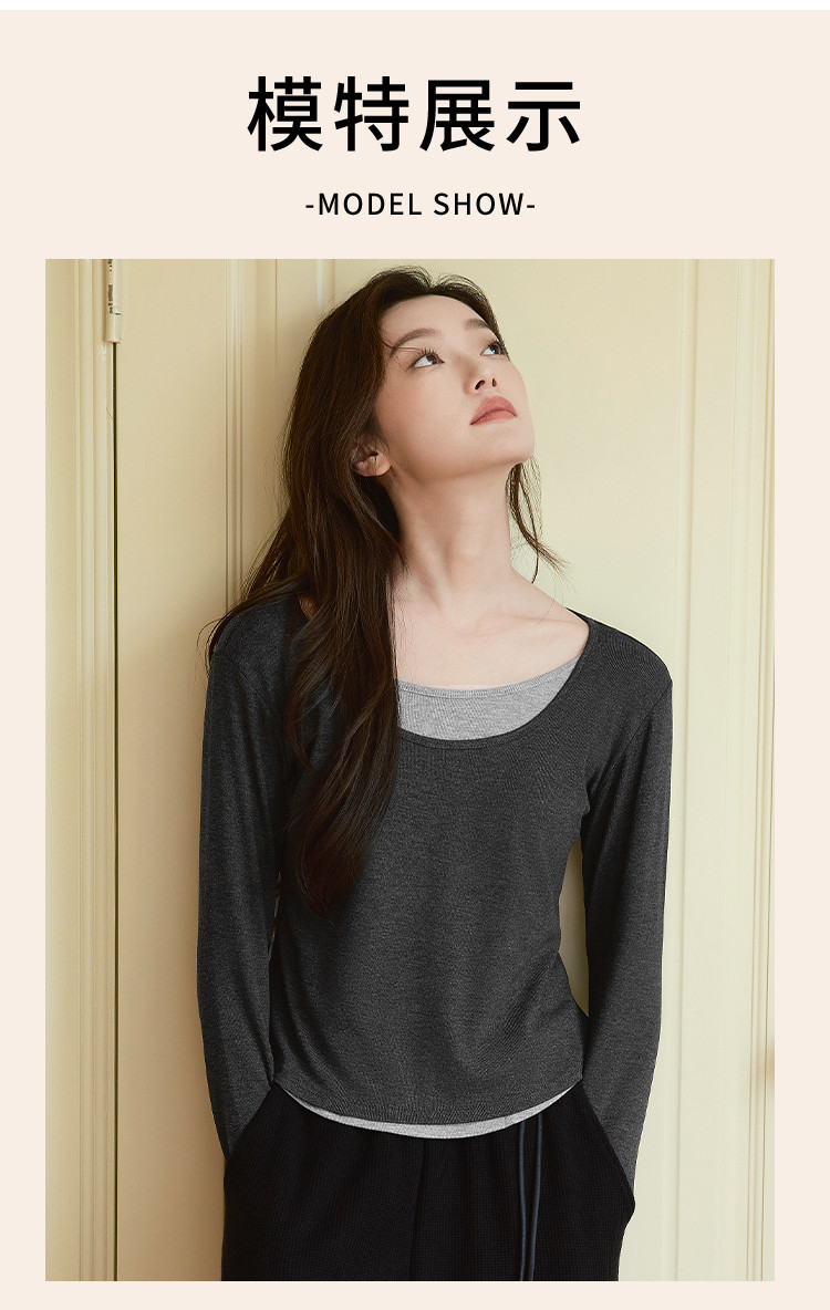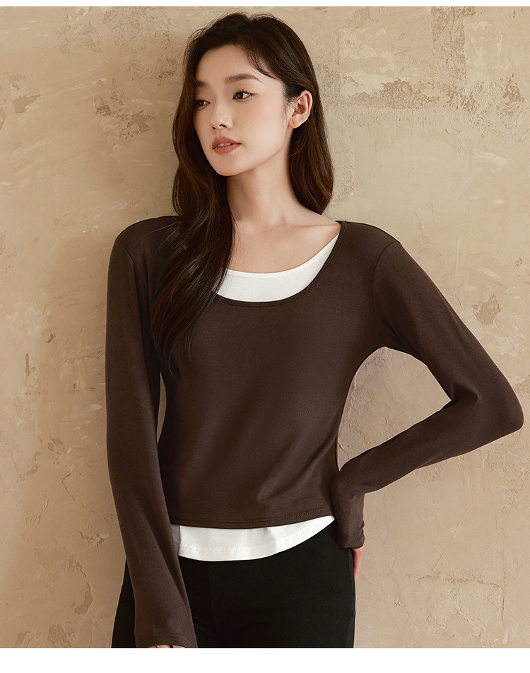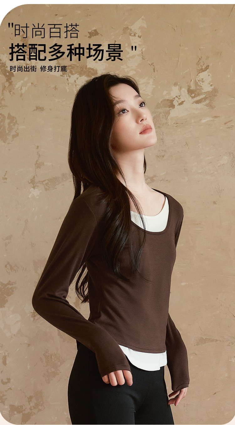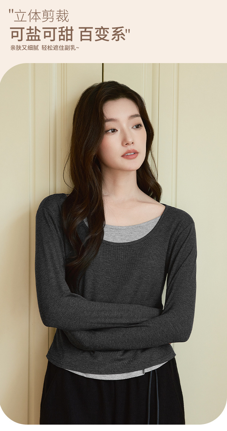 【桑蚕丝醋酸混纺】春秋设计感假两件撞色长袖小个子气质女式t恤 802561