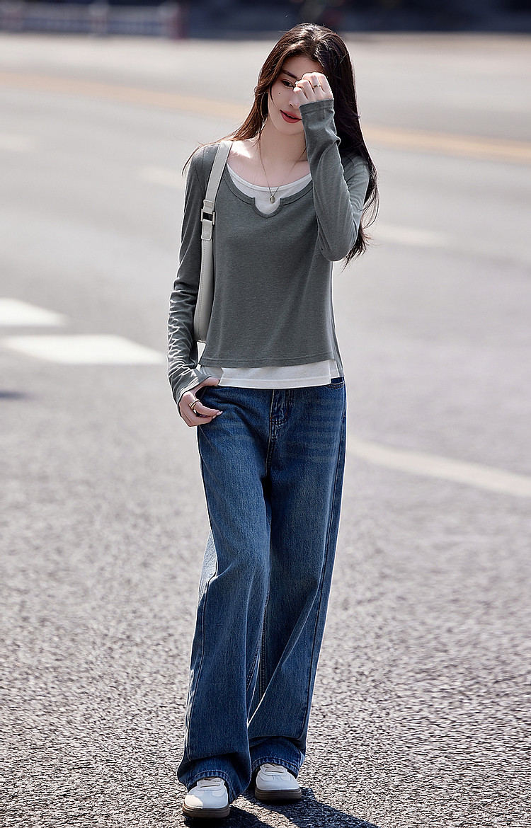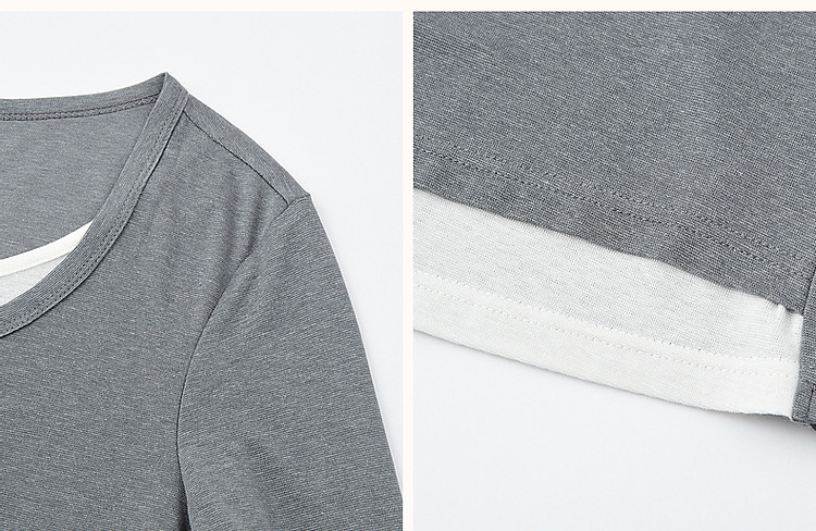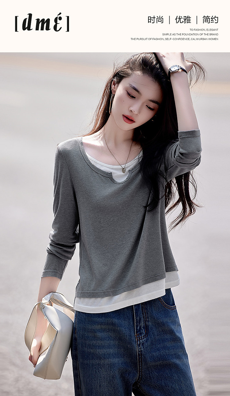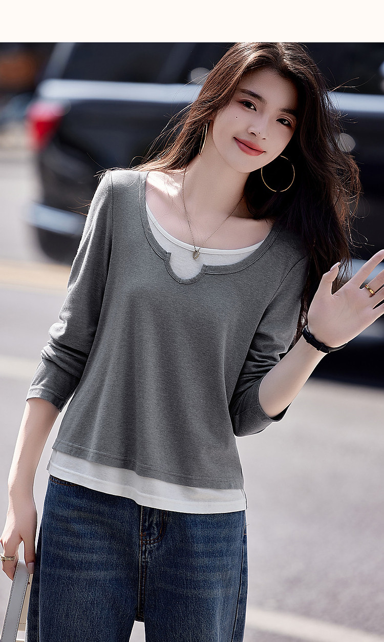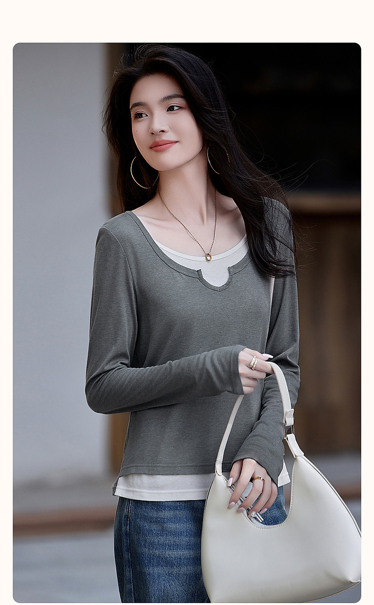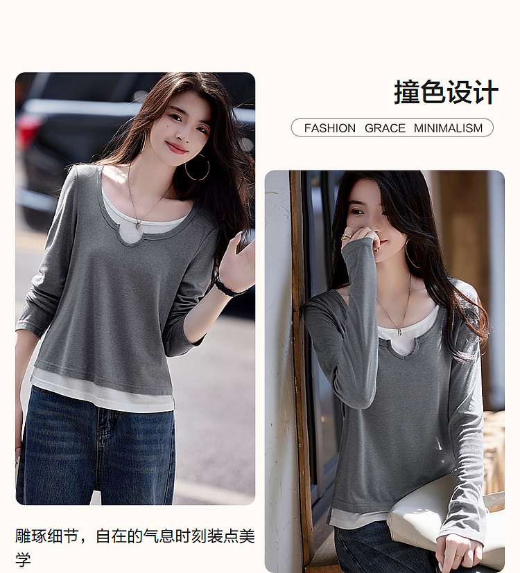 【桑蚕丝醋酸混纺】春秋设计感假两件撞色长袖小个子气质女式t恤 802561