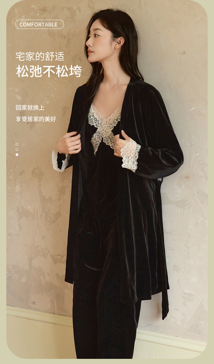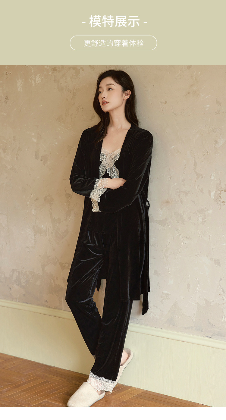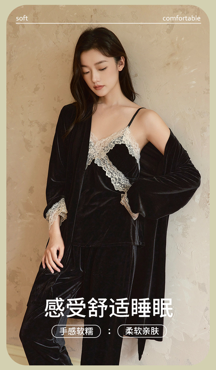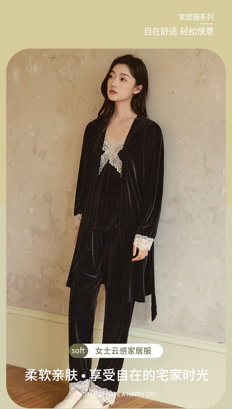商品名称:韩系高级感性感蕾丝吊带睡衣三件套女士家居服柔软亲肤丝滑舒适 912587