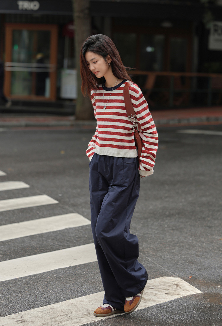【经典撞色条纹】春款圆领套头长袖针织衫女 962434