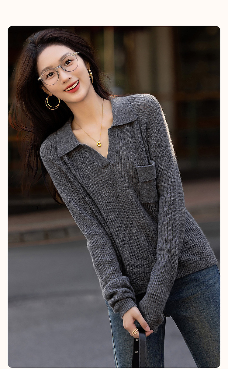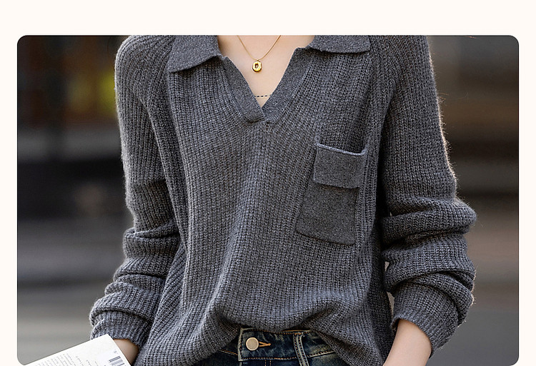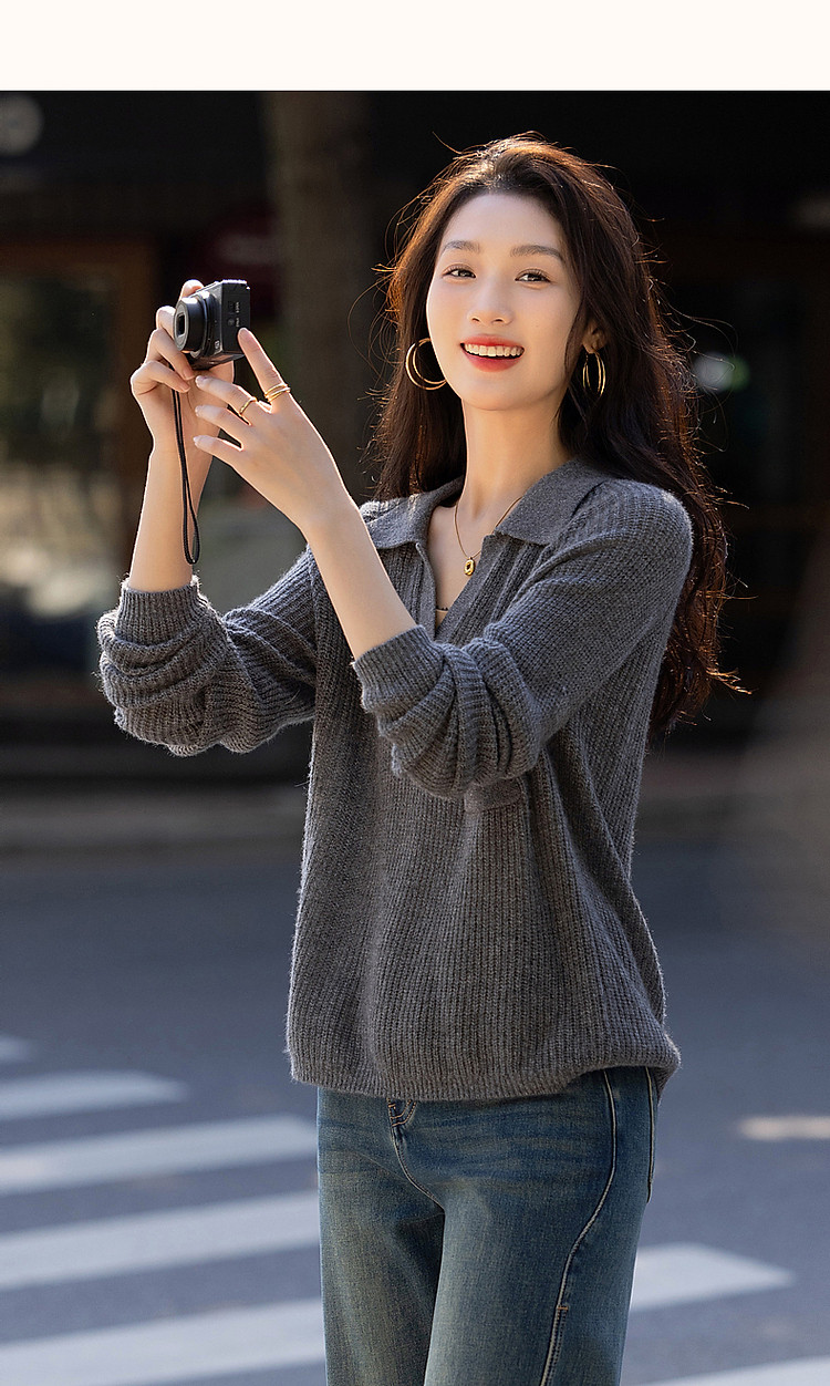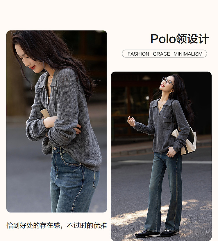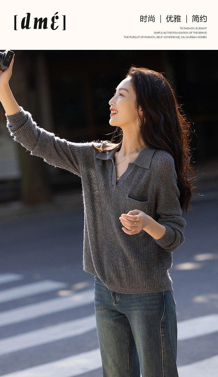 商品名称:【轻量时髦】秋静奢低调蓬松绵羊毛线衫格雷Polo针织衫女上衣 650945