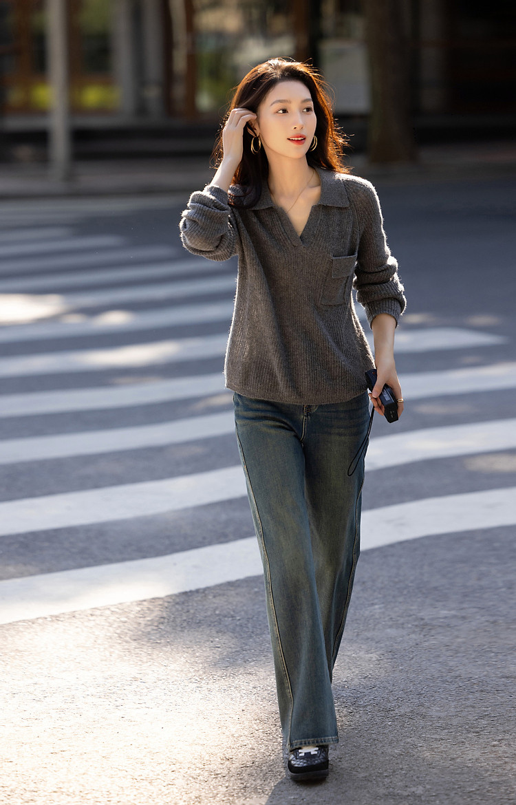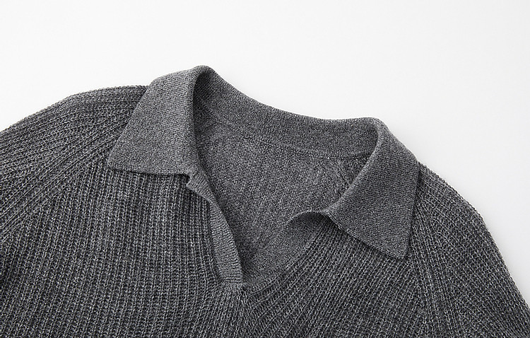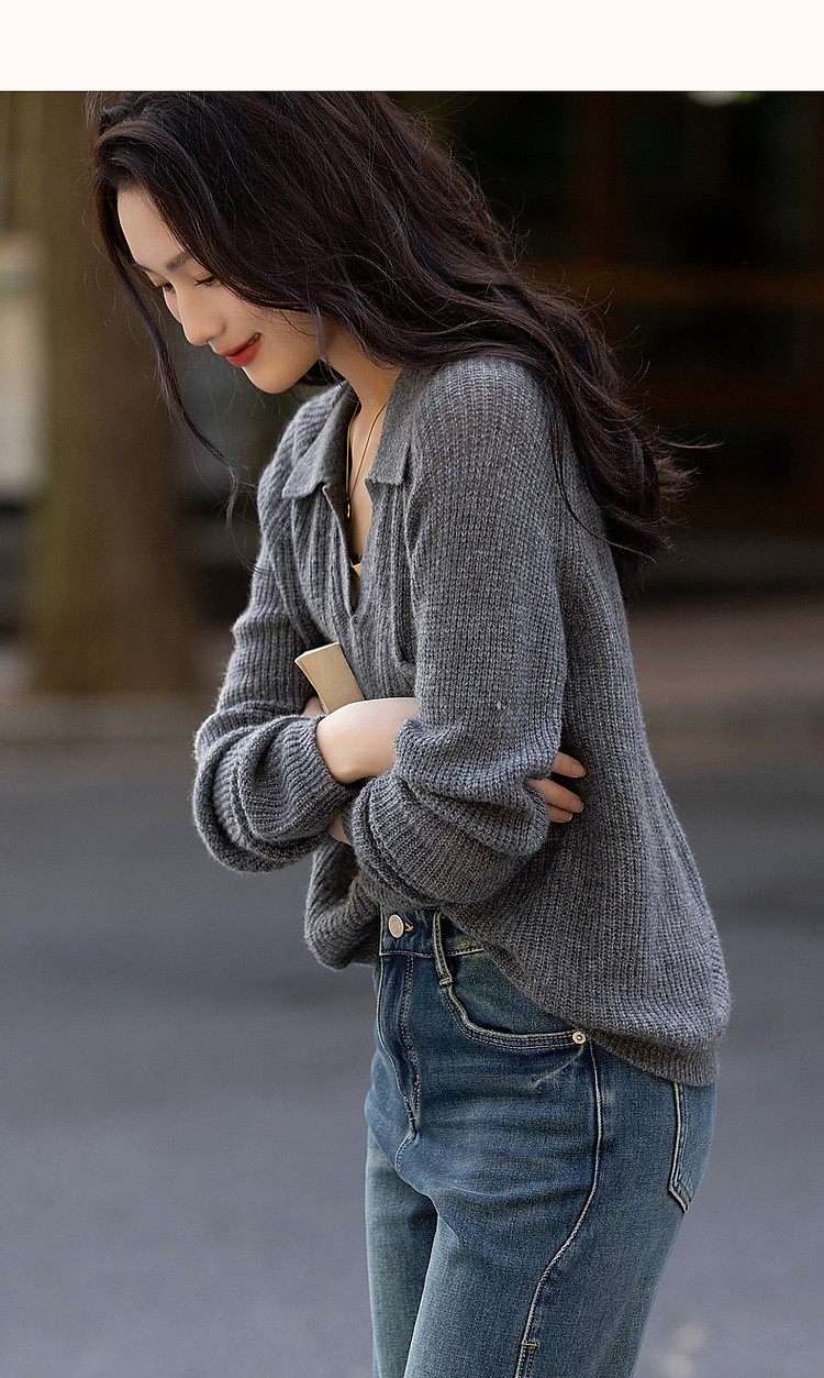 【轻量时髦】秋静奢低调蓬松绵羊毛线衫格雷Polo针织衫女上衣 650945