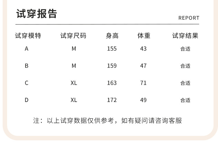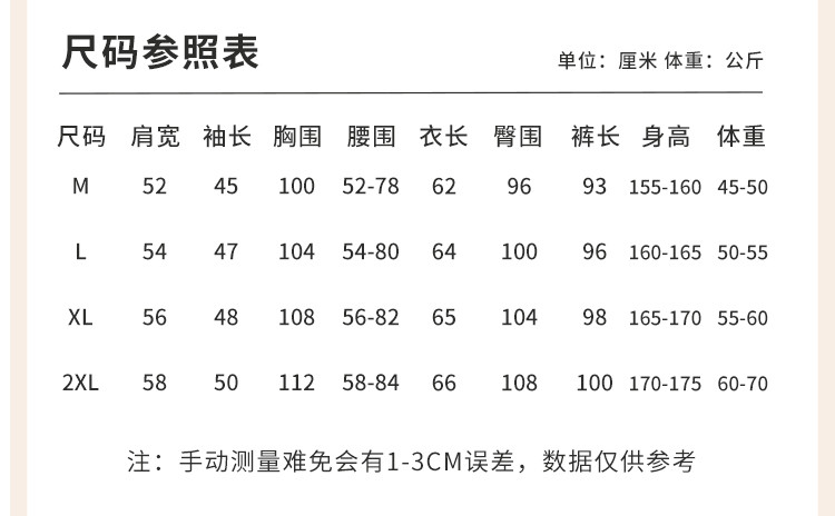 | 尺码 | 肩宽(cm) | 袖长(cm) | 衣长(cm) | 身高(cm) | 腰围(cm) | 裤长(cm) | 体重(kg) | 臀围(cm) | 胸围(cm) | 号型 |