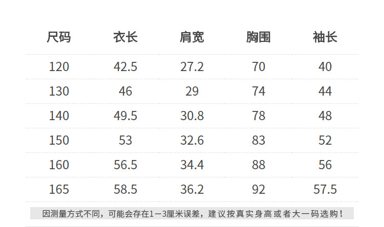 | 尺码 | 衣长(cm) | 肩宽(cm) | 身高(cm) | 袖长(cm) | 适合年龄 | 胸围(cm) | 号型 |