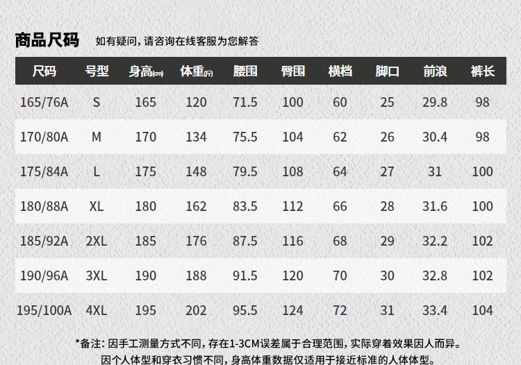 | 尺码 | 裤脚围(cm) | 腰围(cm) | 裤长(cm) | 前浪(cm) | 臀围(cm) | 号型 |