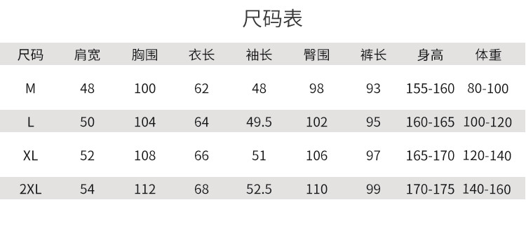 | 尺码 | 肩宽(cm) | 袖长(cm) | 上装号型 | 下装号型 | 衣长(cm) | 身高(cm) | 裤长(cm) | 体重(kg) | 臀围(cm) | 胸围(cm) | 号型 |