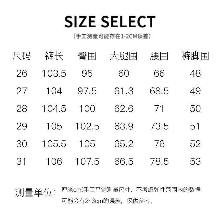 | 尺码 | 大腿围(cm) | 裤脚围(cm) | 前浪(cm) | 后浪(cm) | 腰围(cm) | 裤长(cm) | 膝围(cm) | 臀围(cm) | 号型 |