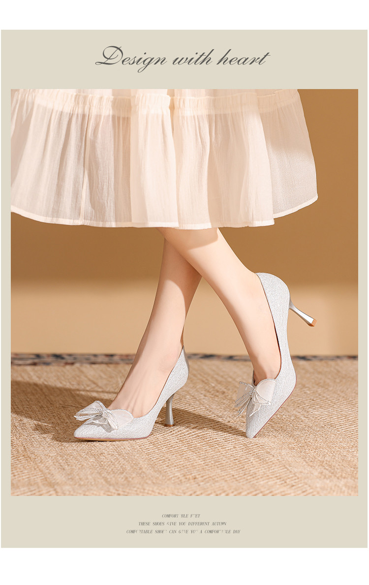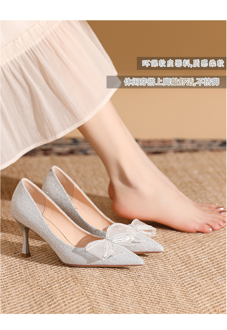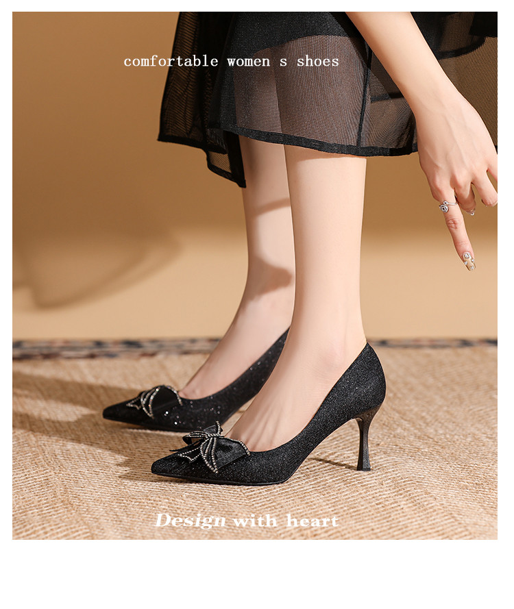 春夏时尚蝴蝶结细跟高跟鞋女气质尖头单鞋时装鞋一脚蹬职场通勤鞋 331543
