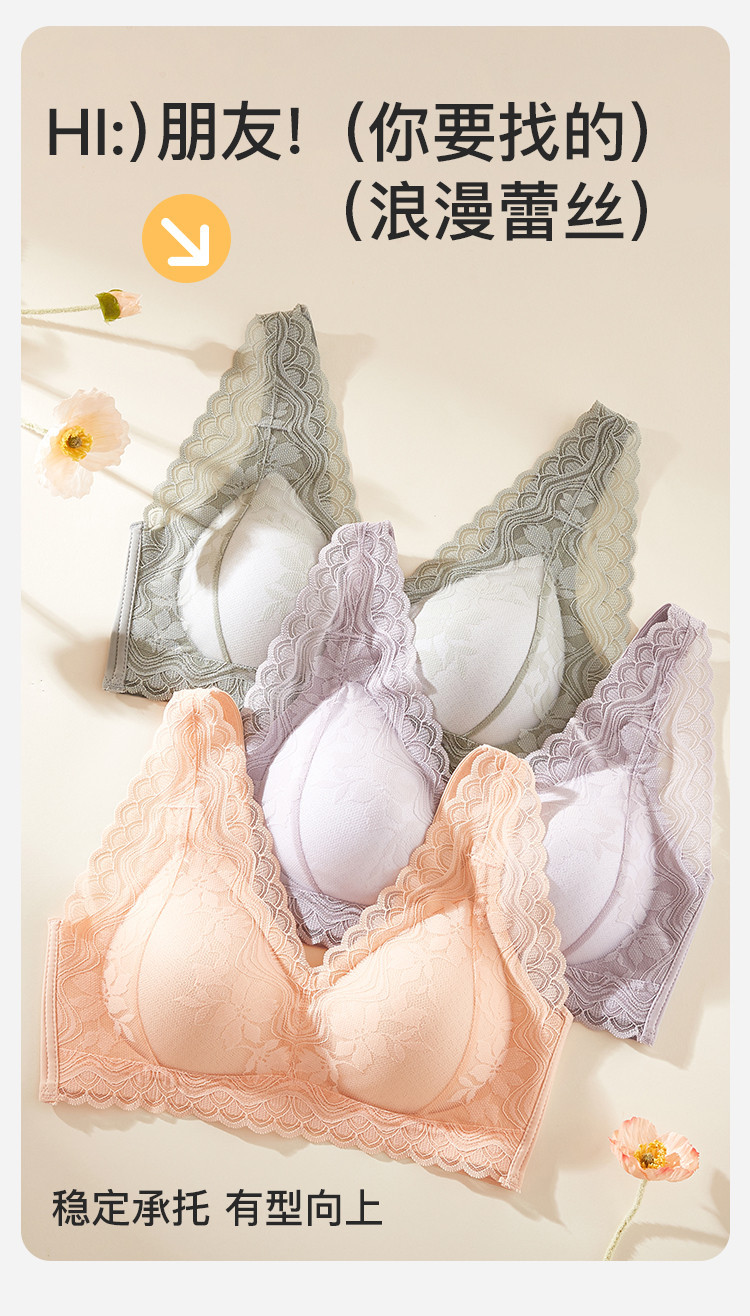 【聚拢减压】无钢圈内衣深V防下垂收副乳蕾丝花瓣提拉聚拢文胸罩 082507