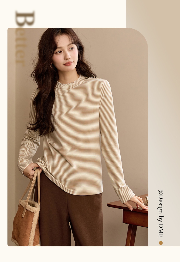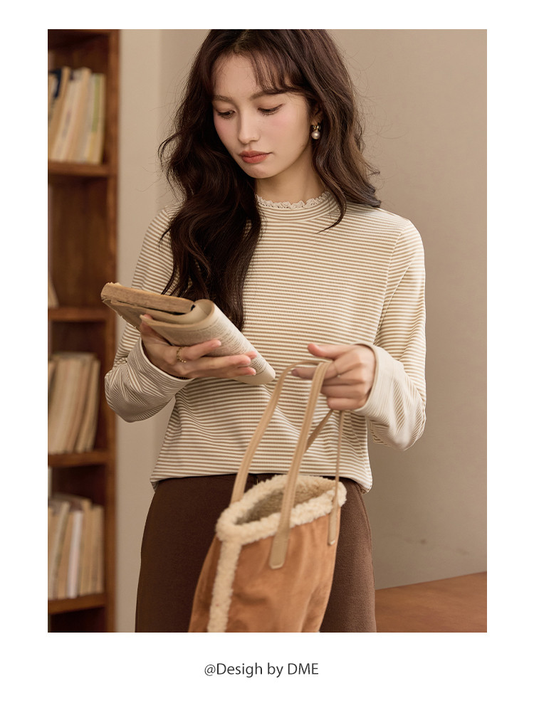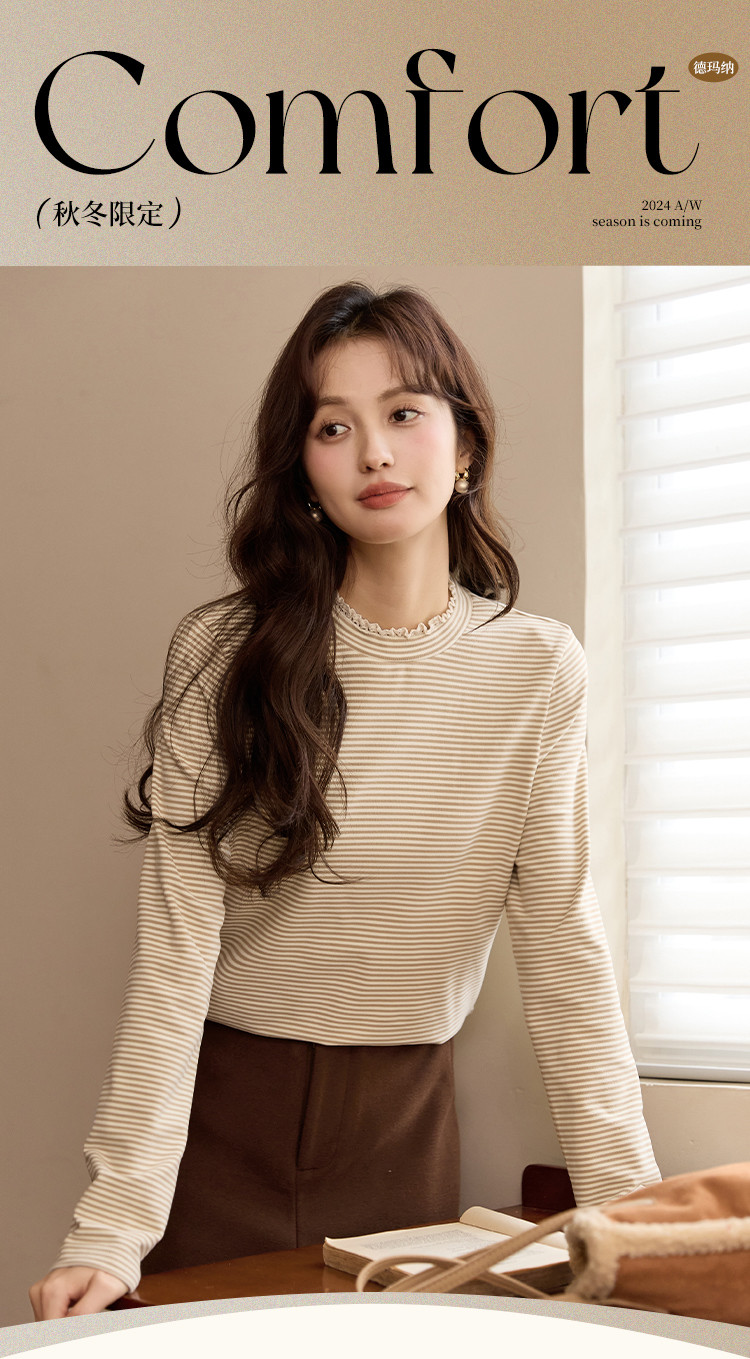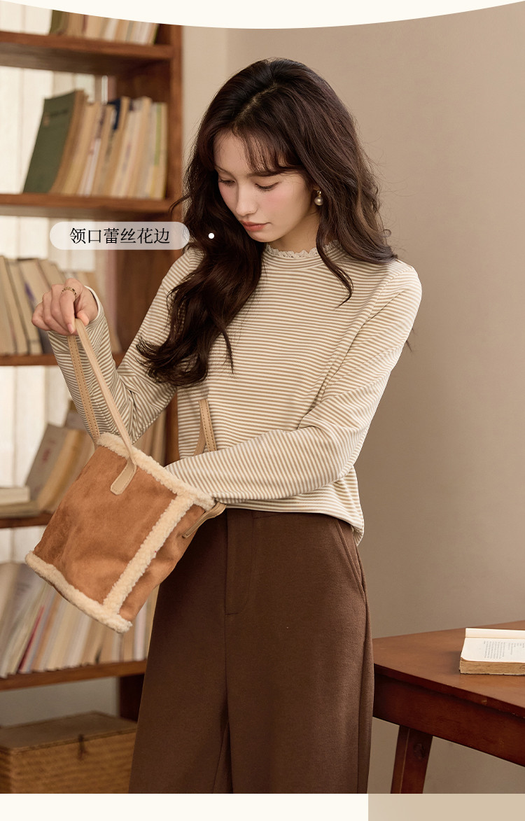 【暖枫秋栗】春秋轻磨毛半高领长袖t恤女蕾丝拼接条纹打底衫女 860481