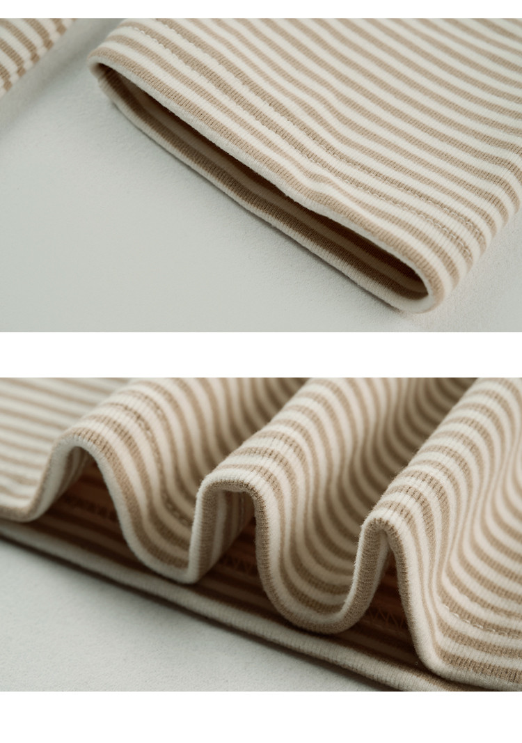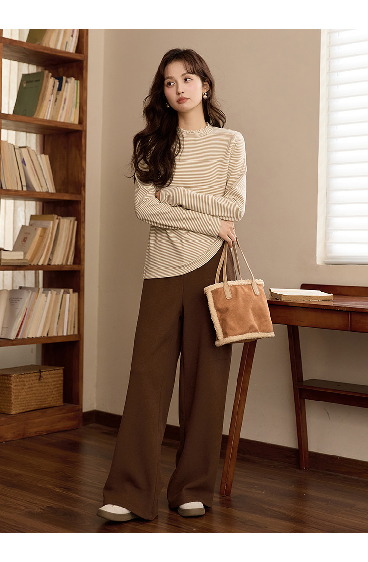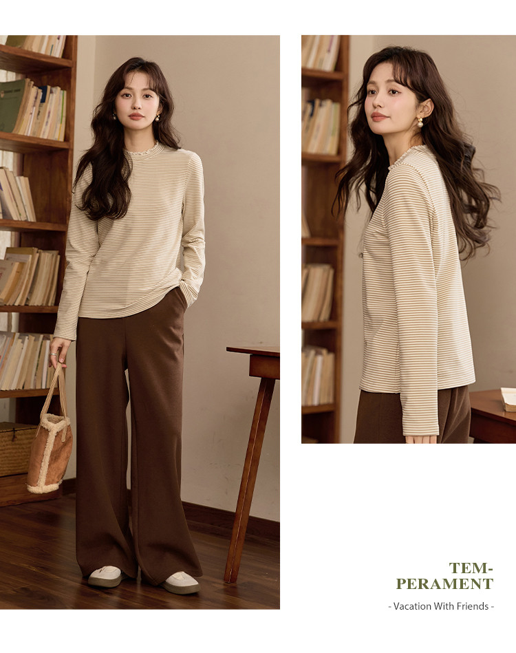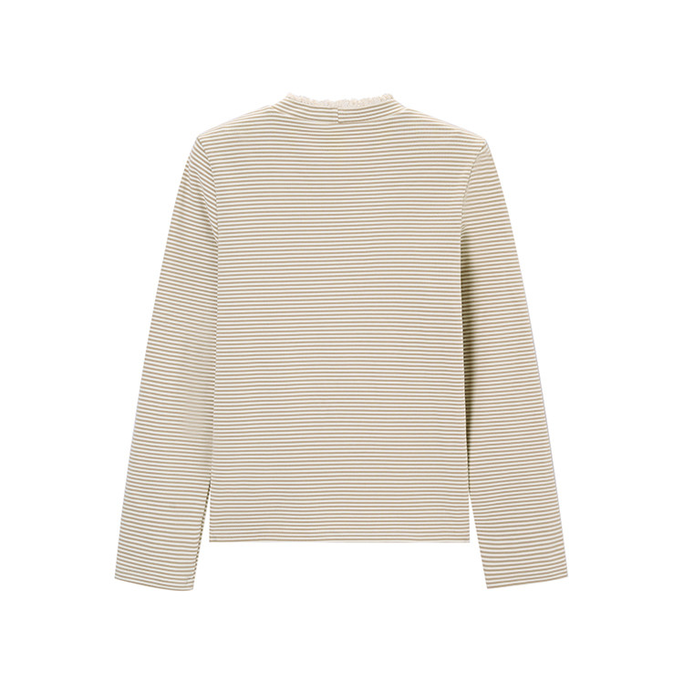 【暖枫秋栗】春秋轻磨毛半高领长袖t恤女蕾丝拼接条纹打底衫女 860481