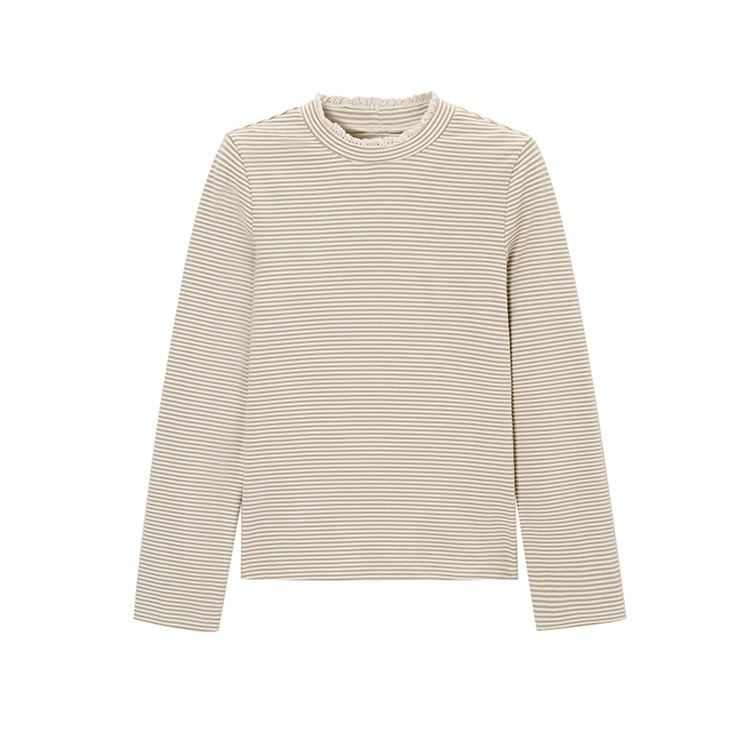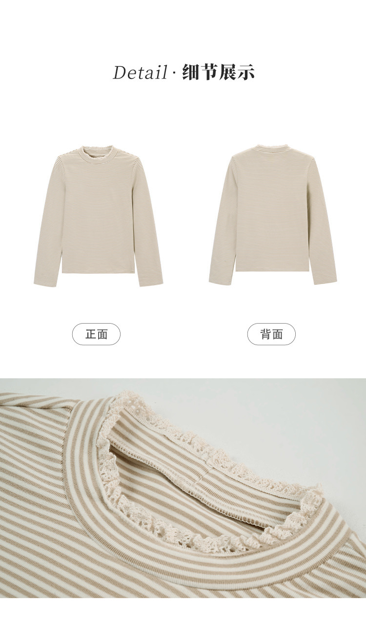 商品名称:【暖枫秋栗】春秋轻磨毛半高领长袖t恤女蕾丝拼接条纹打底衫女 860481