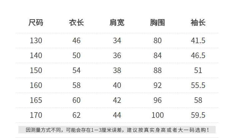 | 140cm | 50 | 36 | 140 | 46.5 | 8-11岁 | 84 | 140/68 |