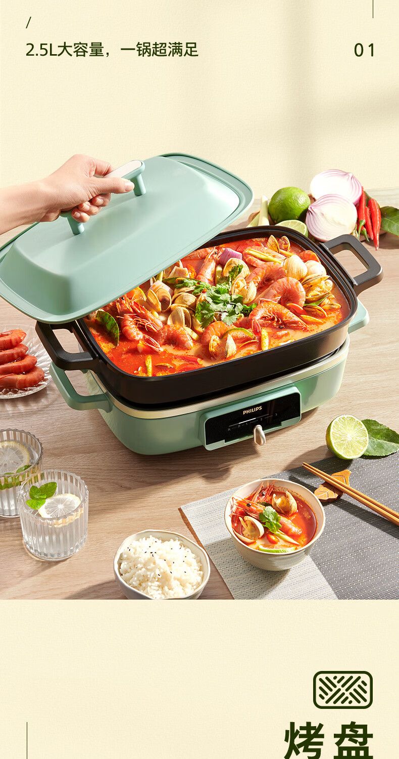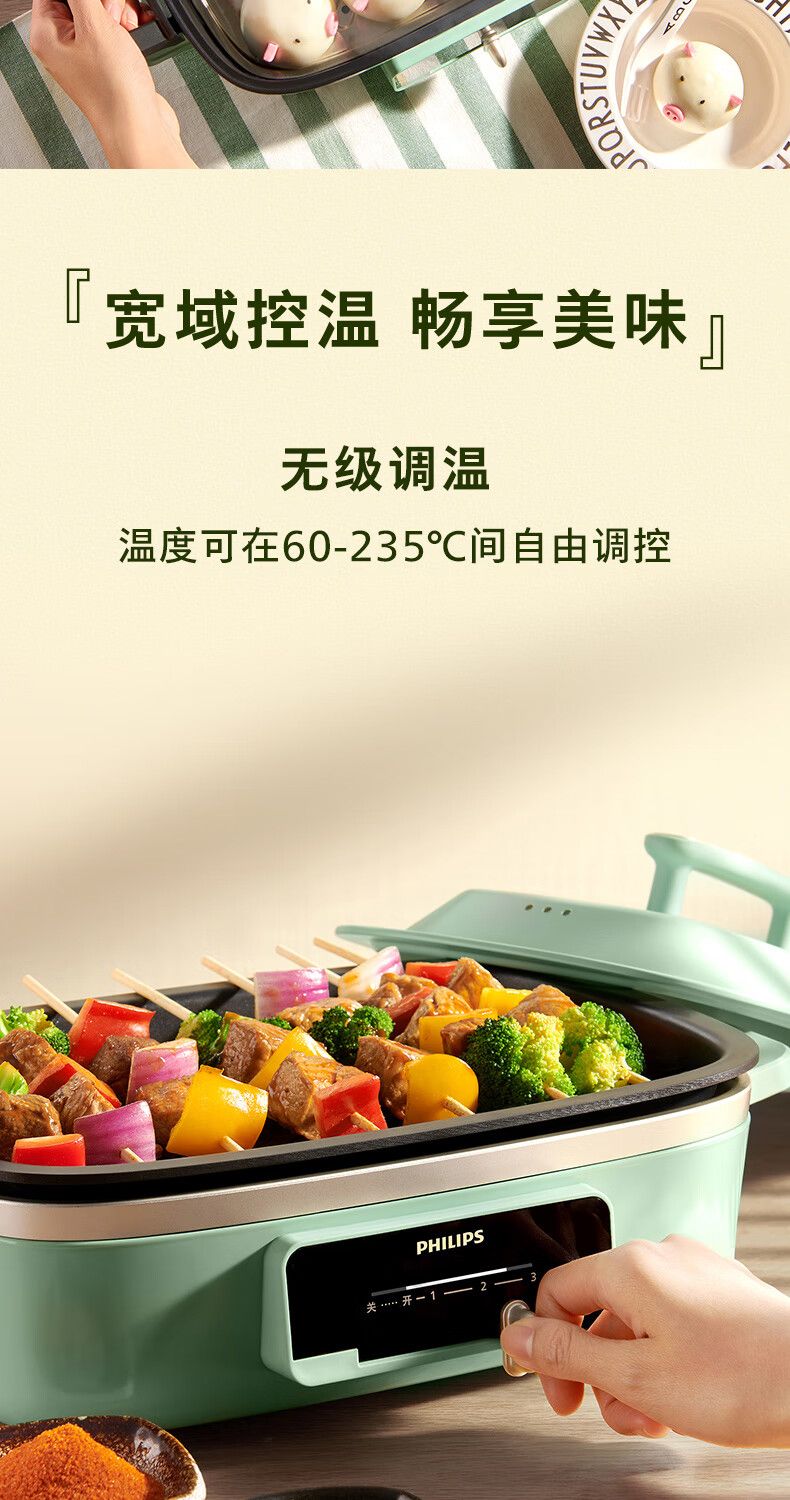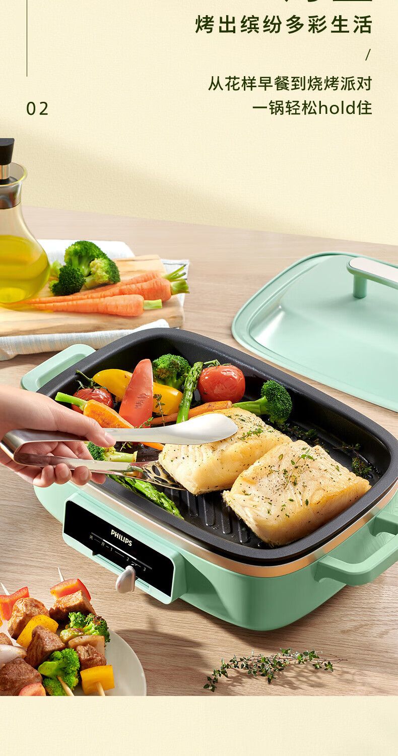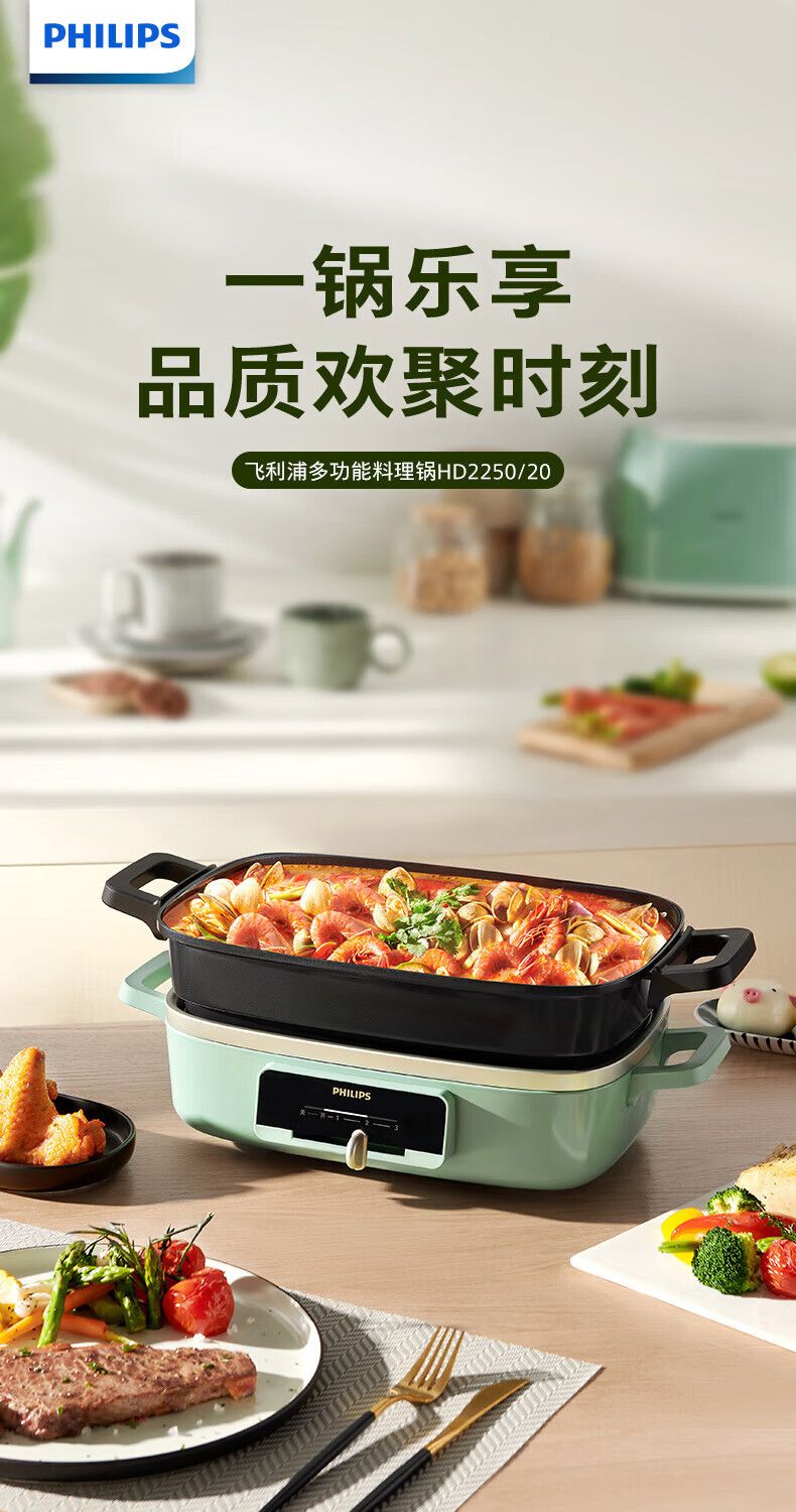 飞利浦多用途锅HD2250 多功能电火锅 烤肉锅 安心涂层轻油少烟多档控温 1400W大功率料理锅