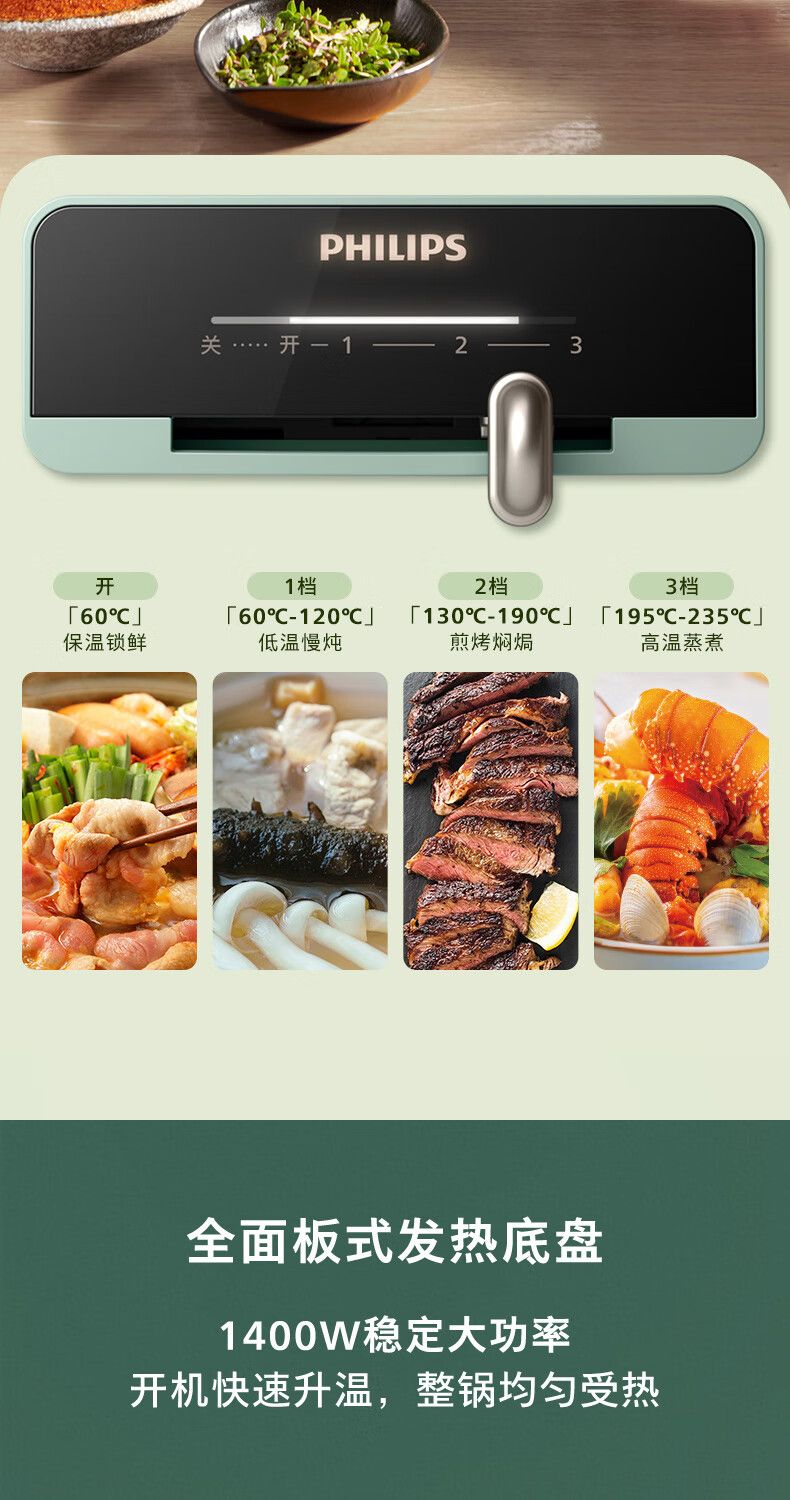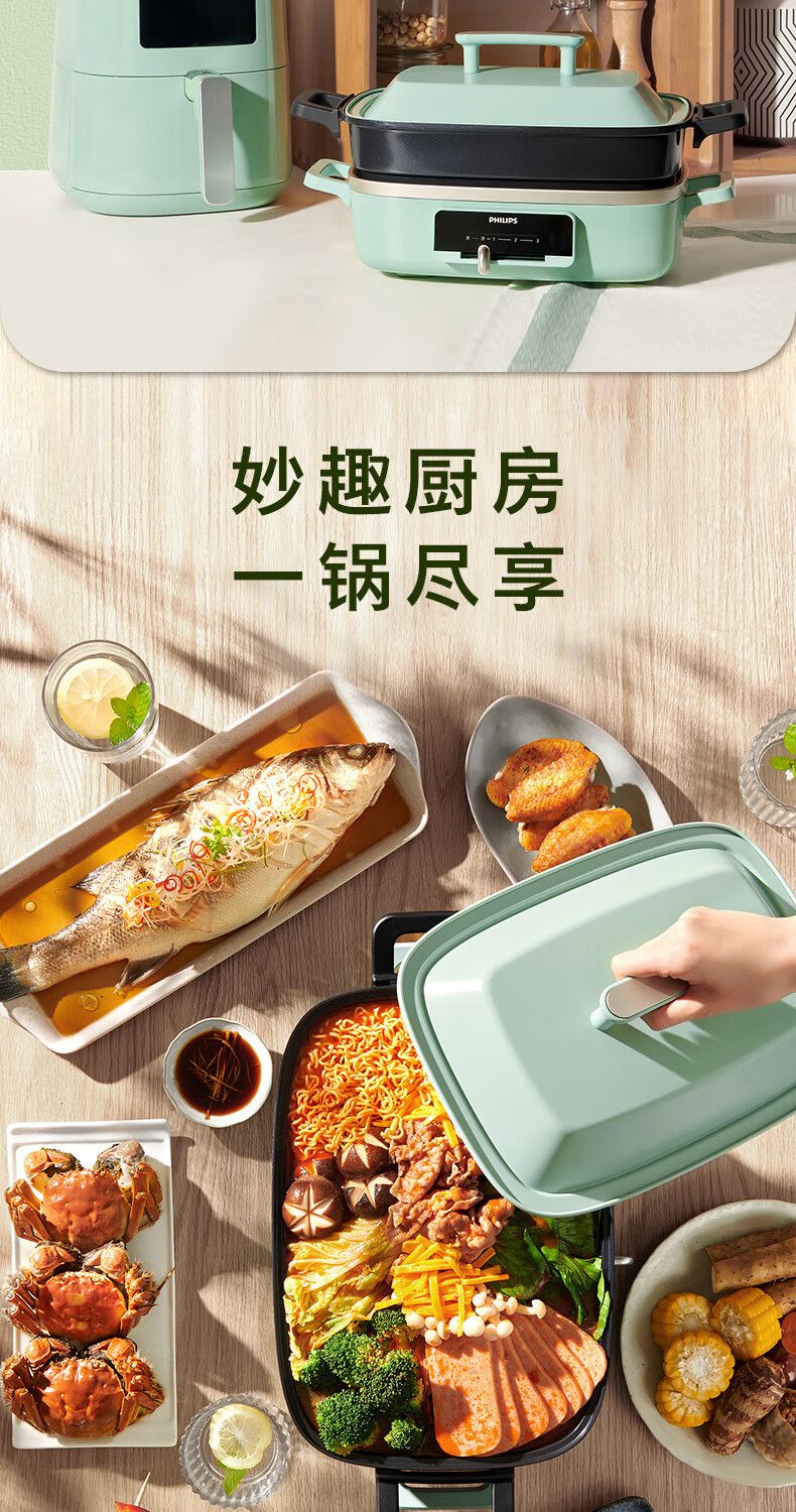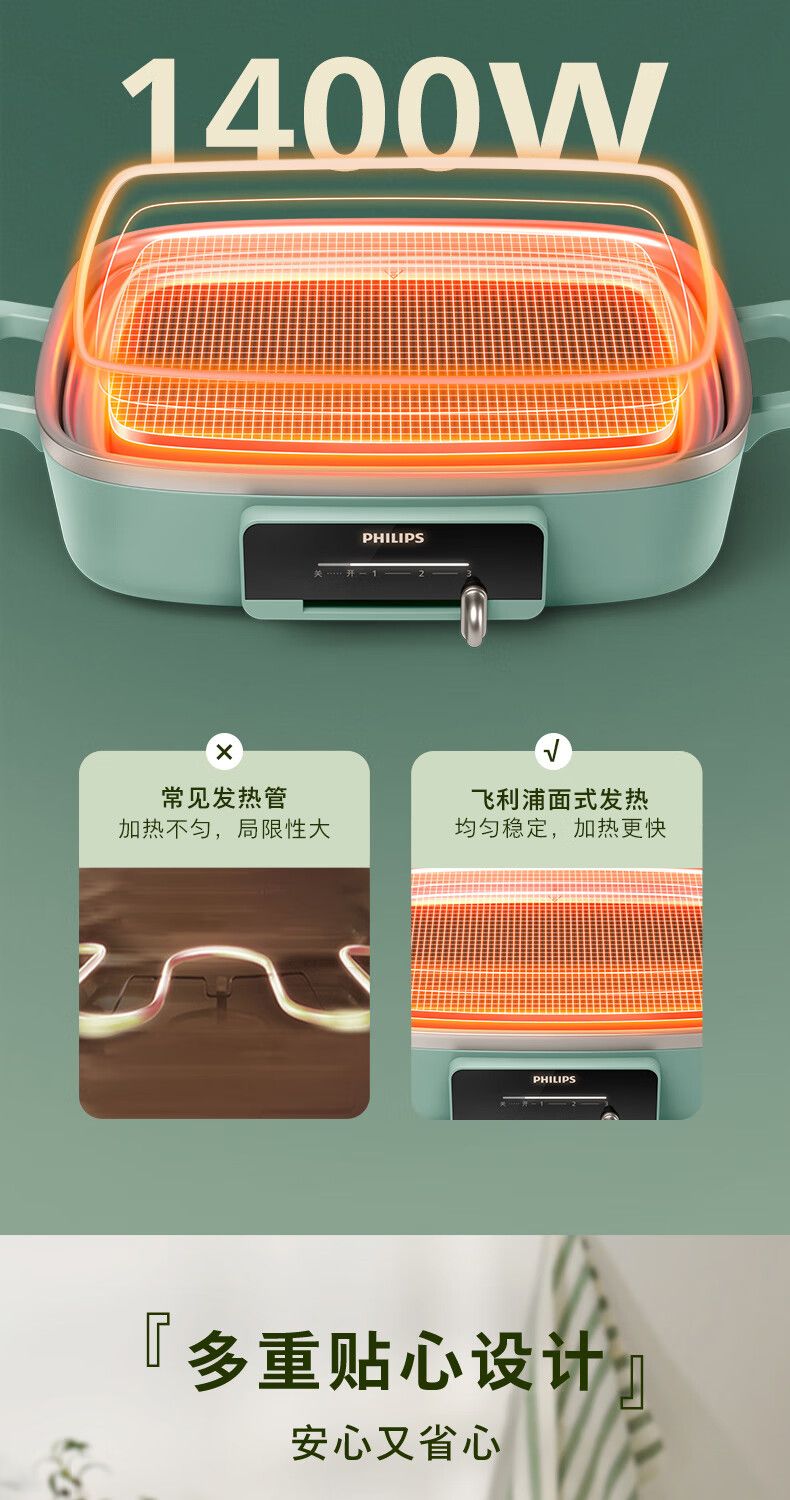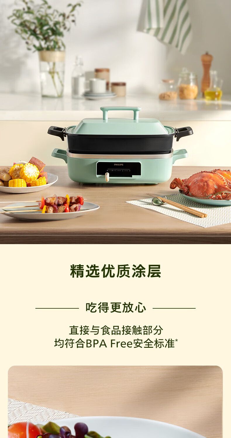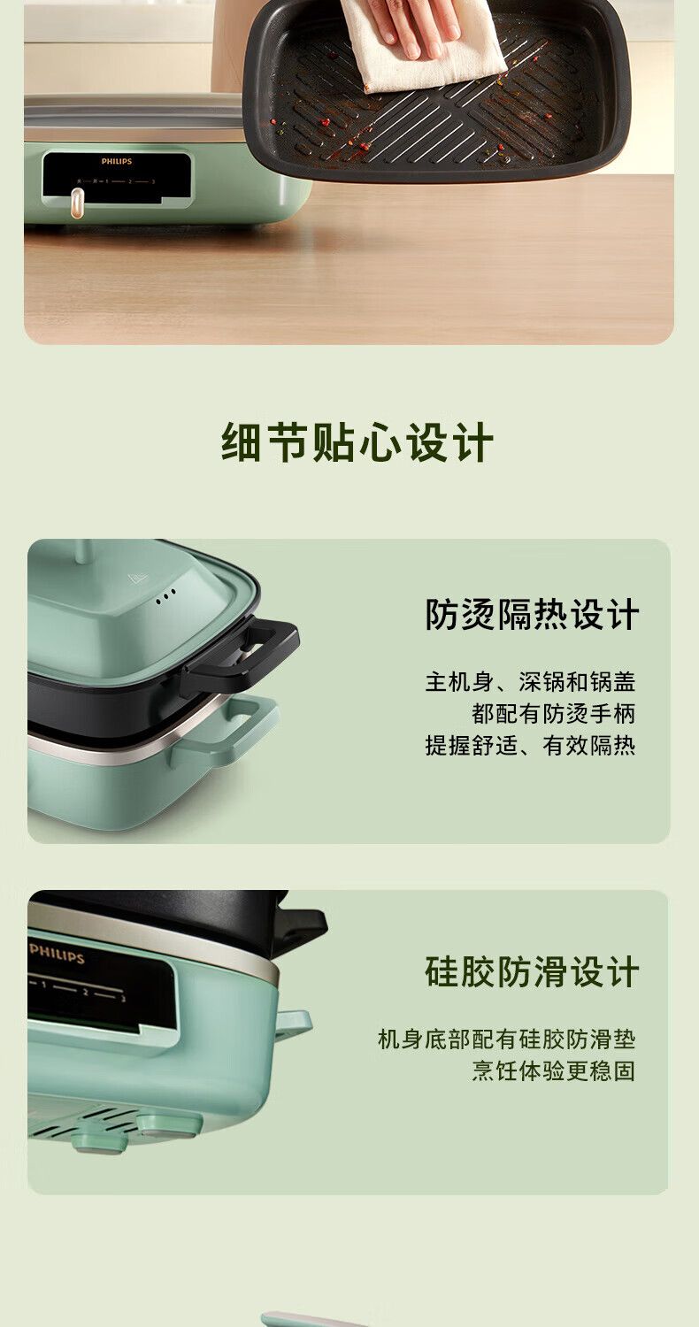 飞利浦多用途锅HD2250 多功能电火锅 烤肉锅 安心涂层轻油少烟多档控温 1400W大功率料理锅