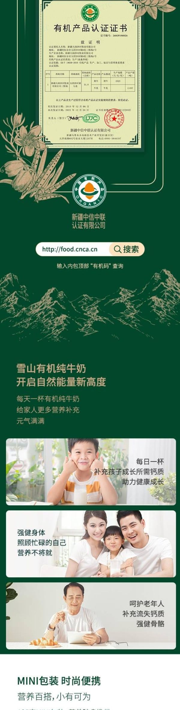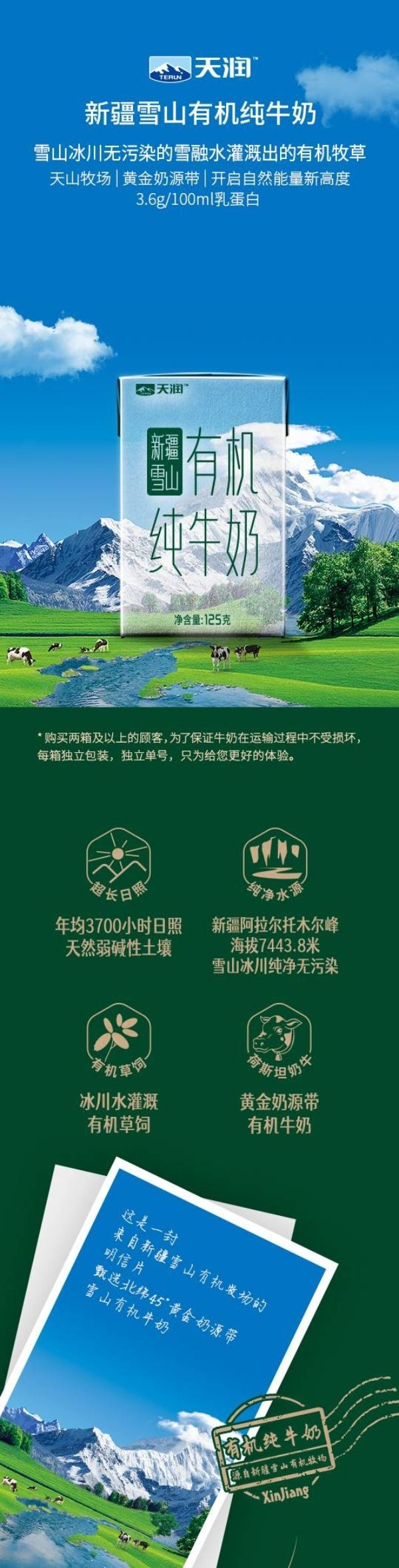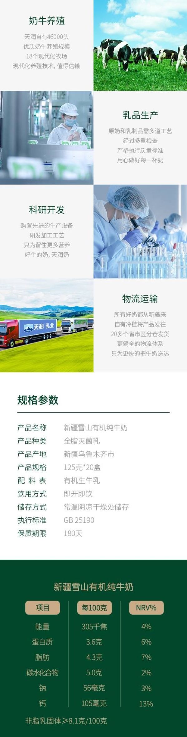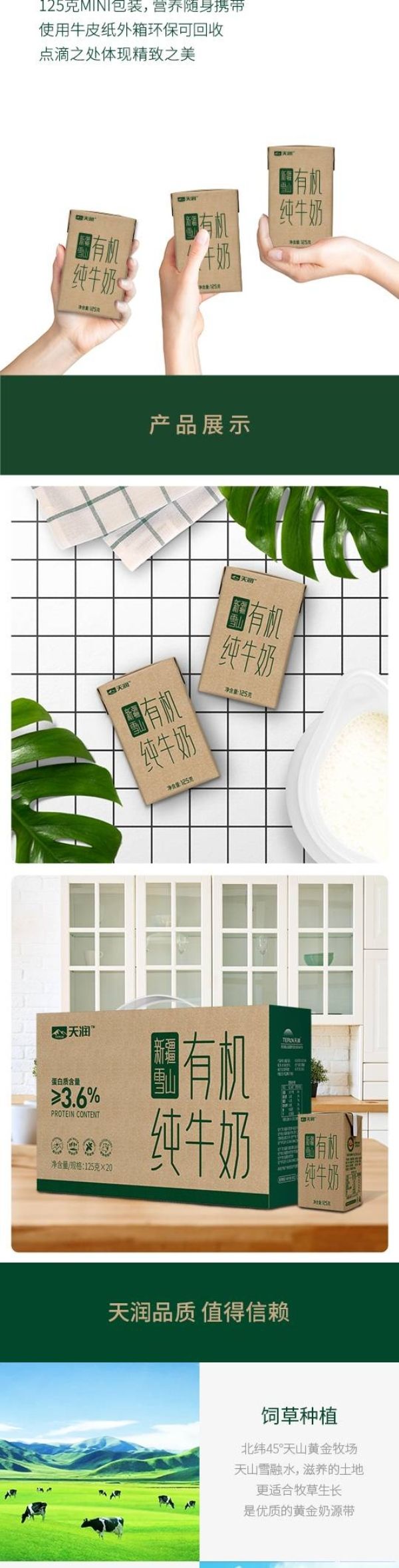 商品名称:天润新疆雪山有机纯牛奶(康美砖)125g/盒*20*箱