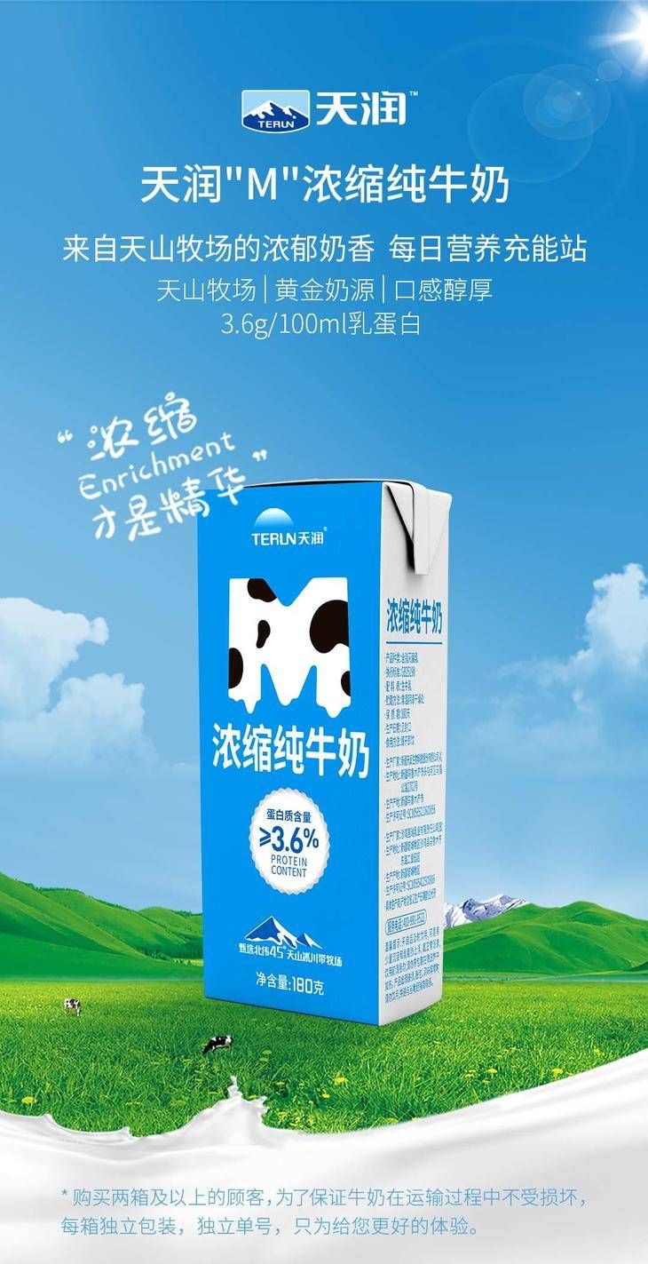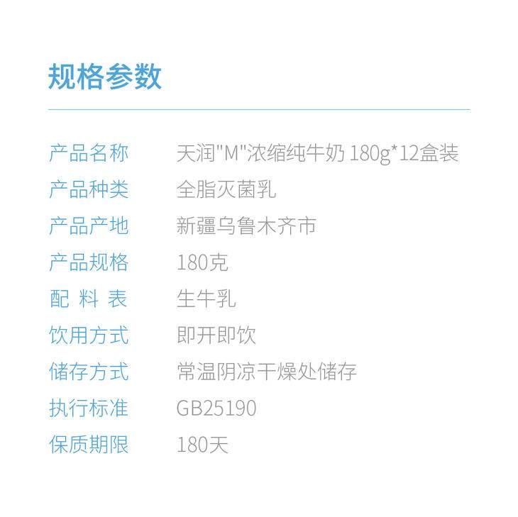 商品名称:天润浓缩纯牛奶(M版康美砖)180g*12盒/箱
