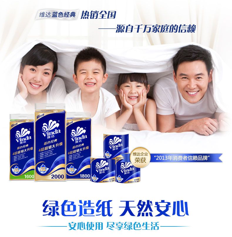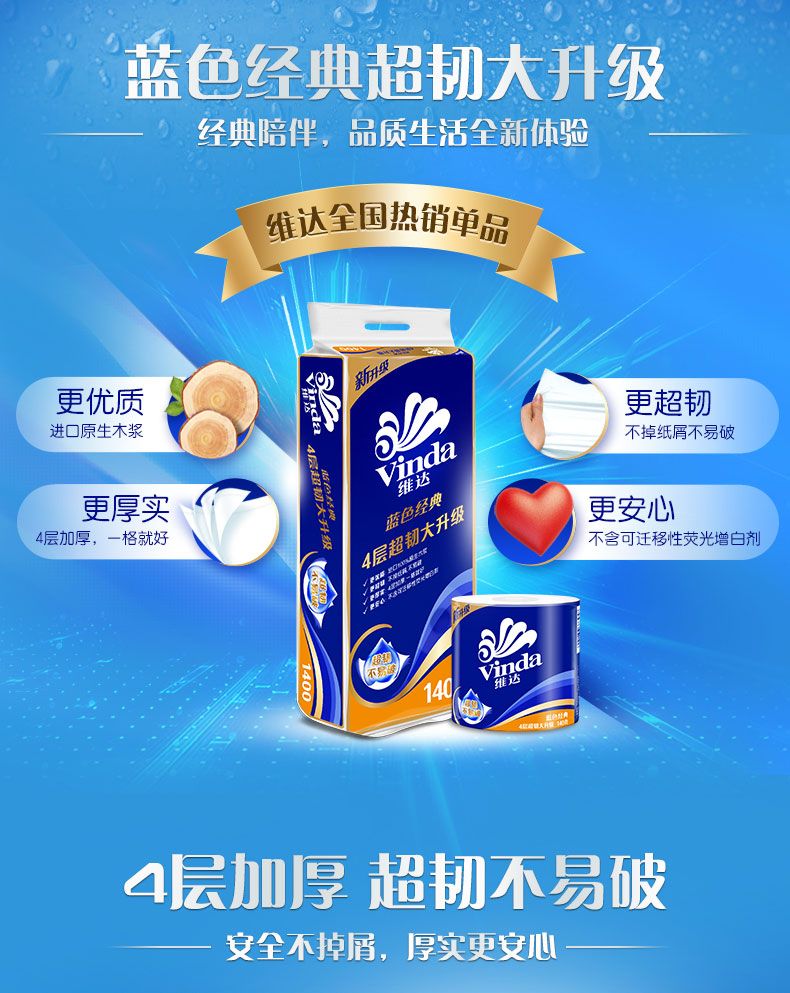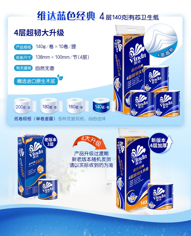 商品名称:维达卷纸140克4层蓝色经典系列柔韧升级有芯卷筒家用卫生纸巾10卷【V4069】