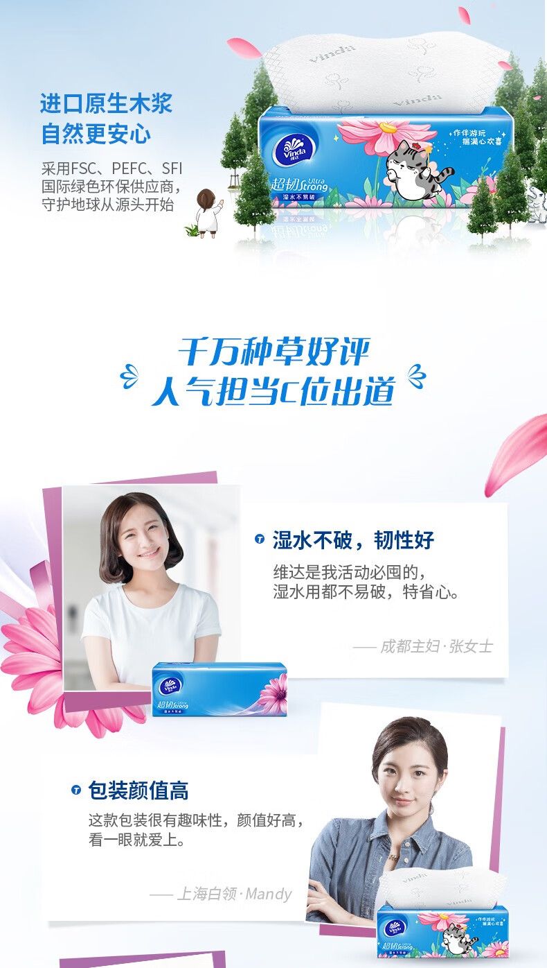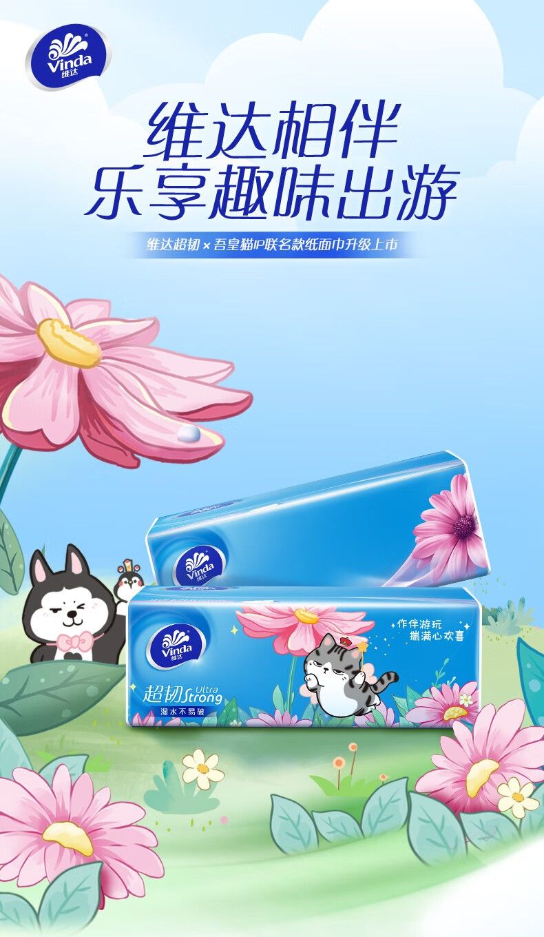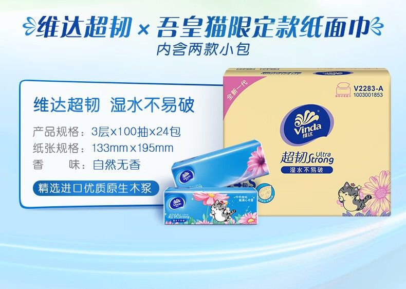 商品名称:维达超韧抽纸纸巾吾皇猫限定款S码3层100抽面巾纸餐巾纸婴儿24包【V2283-A】