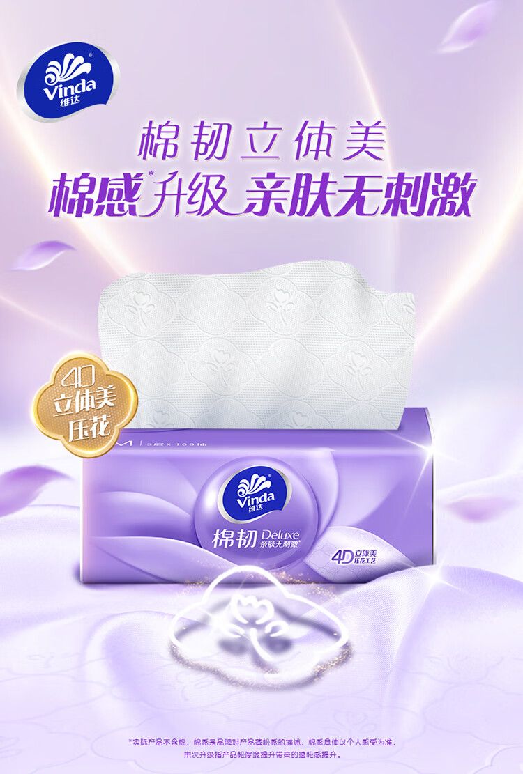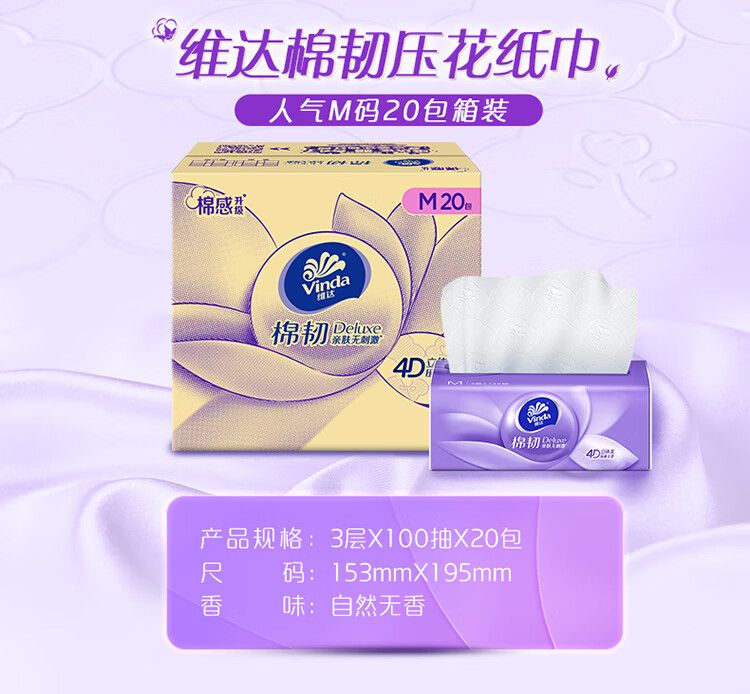 商品名称:维达(Vinda)抽纸棉韧3层100抽20包M码大尺寸 餐巾纸整箱抽纸100抽20包M码【V2880】