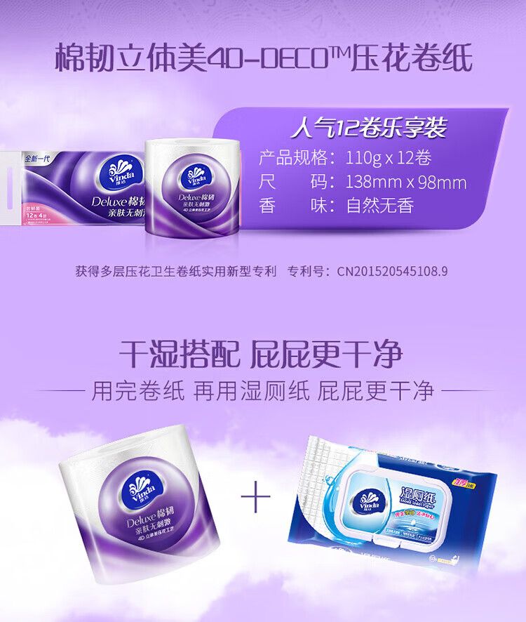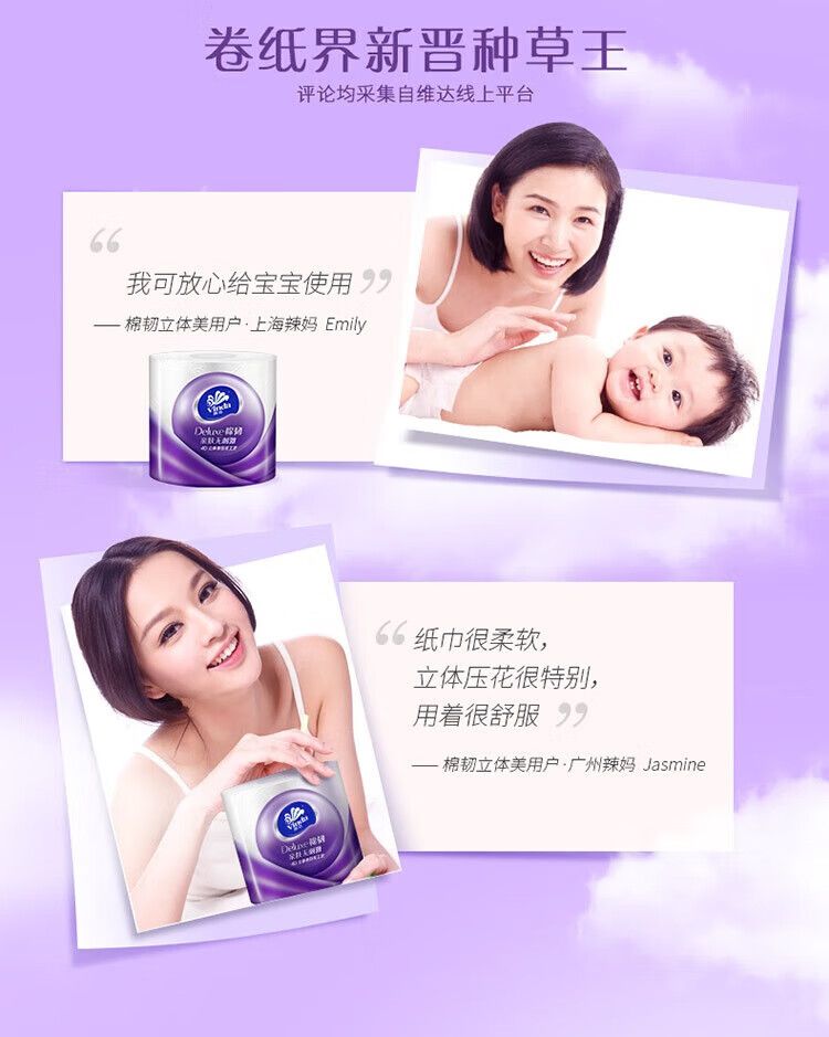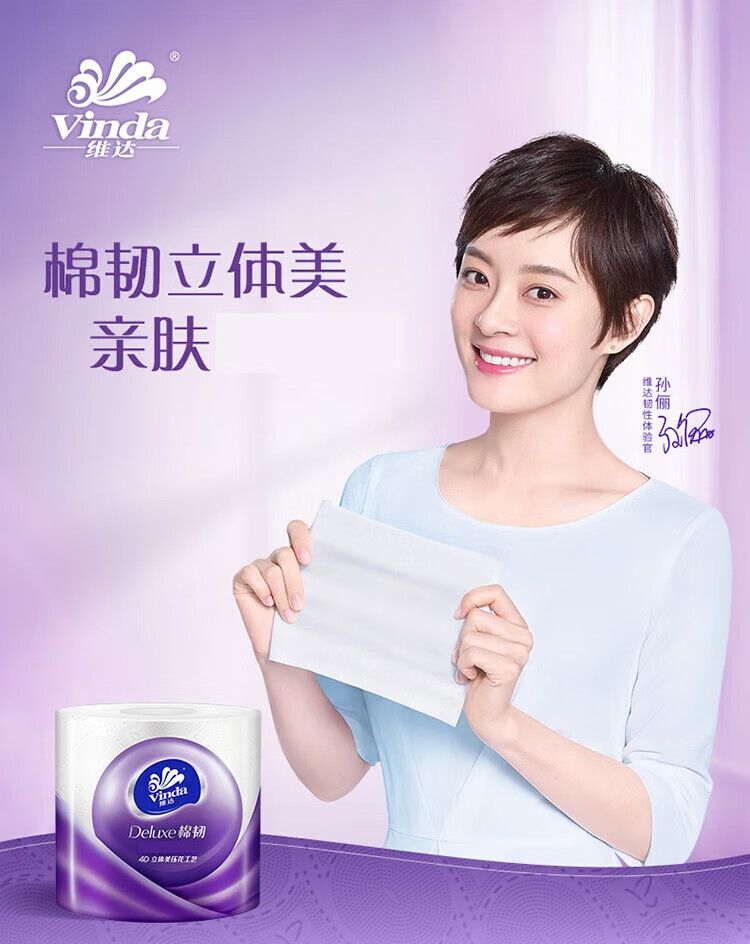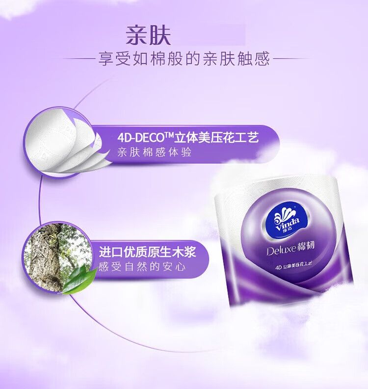 商品名称:维达(VINDA) 温和亲肤不掉屑压花有芯卷纸卫生纸 4层110g*12卷【V4669】