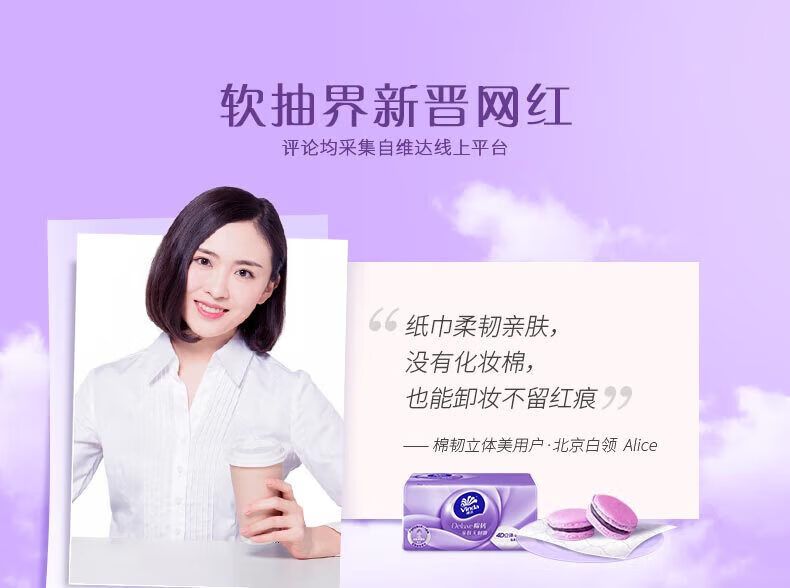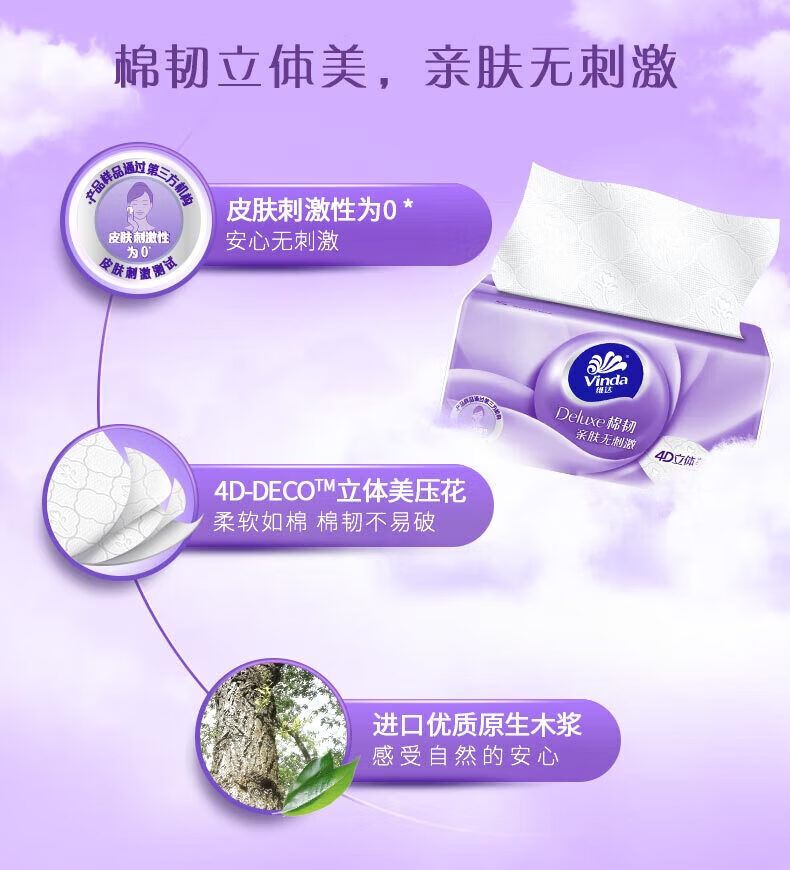 商品名称:维达(vinda)抽纸 棉韧3层100抽*8包/提 亲肤无刺激 卫生纸纸巾餐巾纸【V2833-8包】