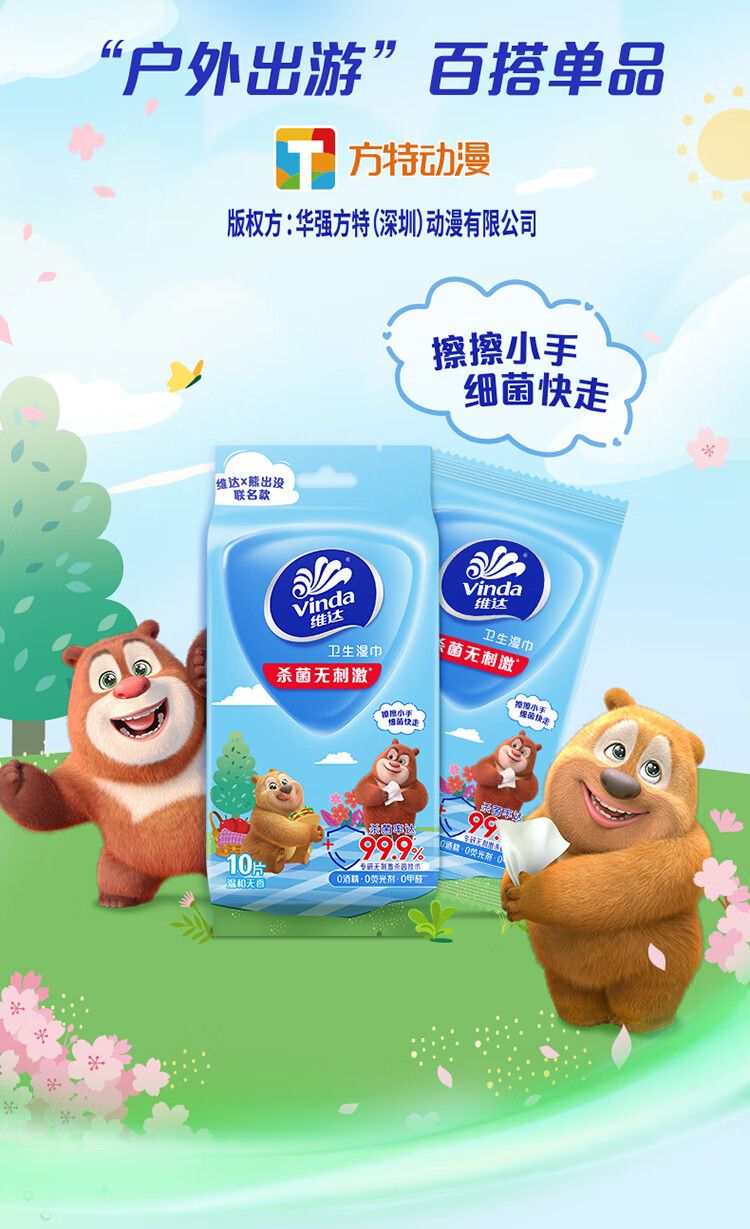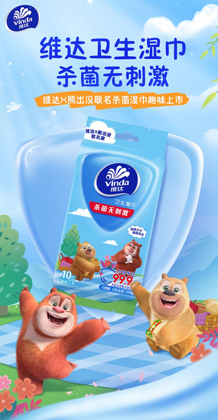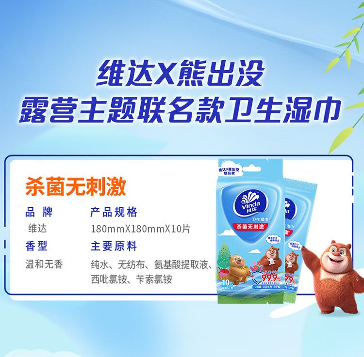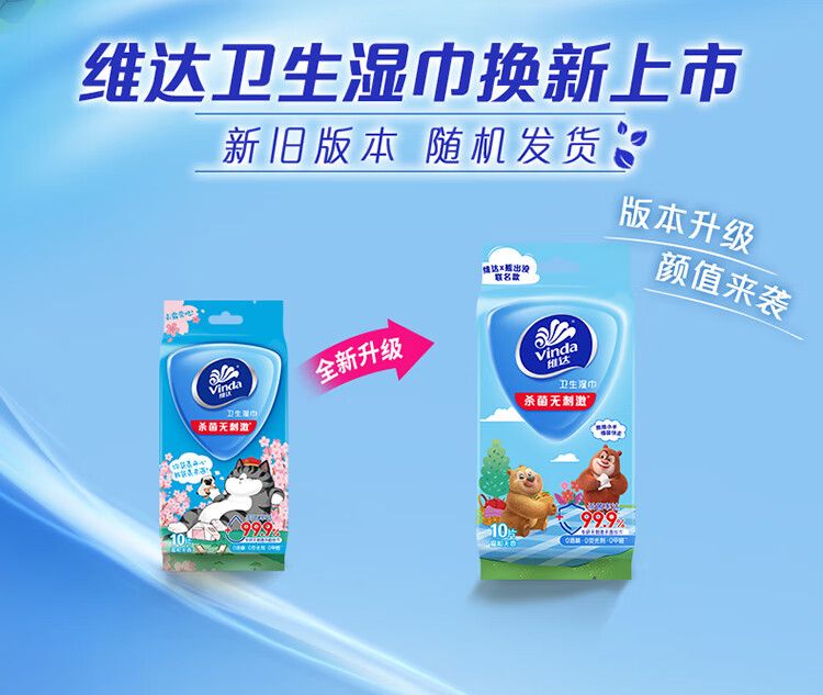 商品名称:维达杀菌湿巾10片每包吾皇限定款独立装 温和母婴可用10包装【10xVW1003】