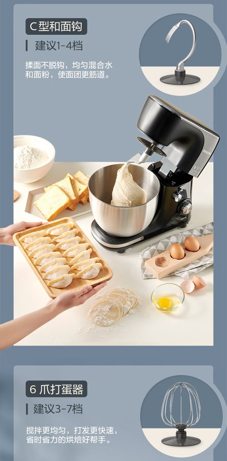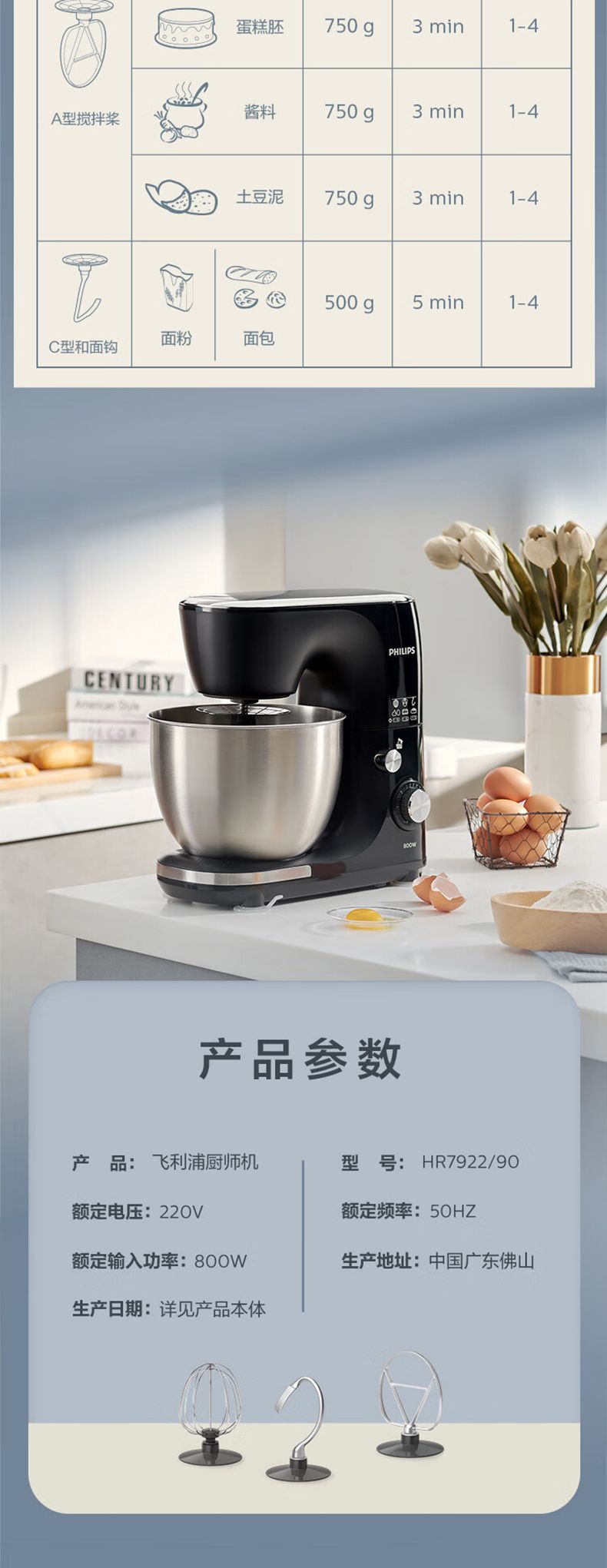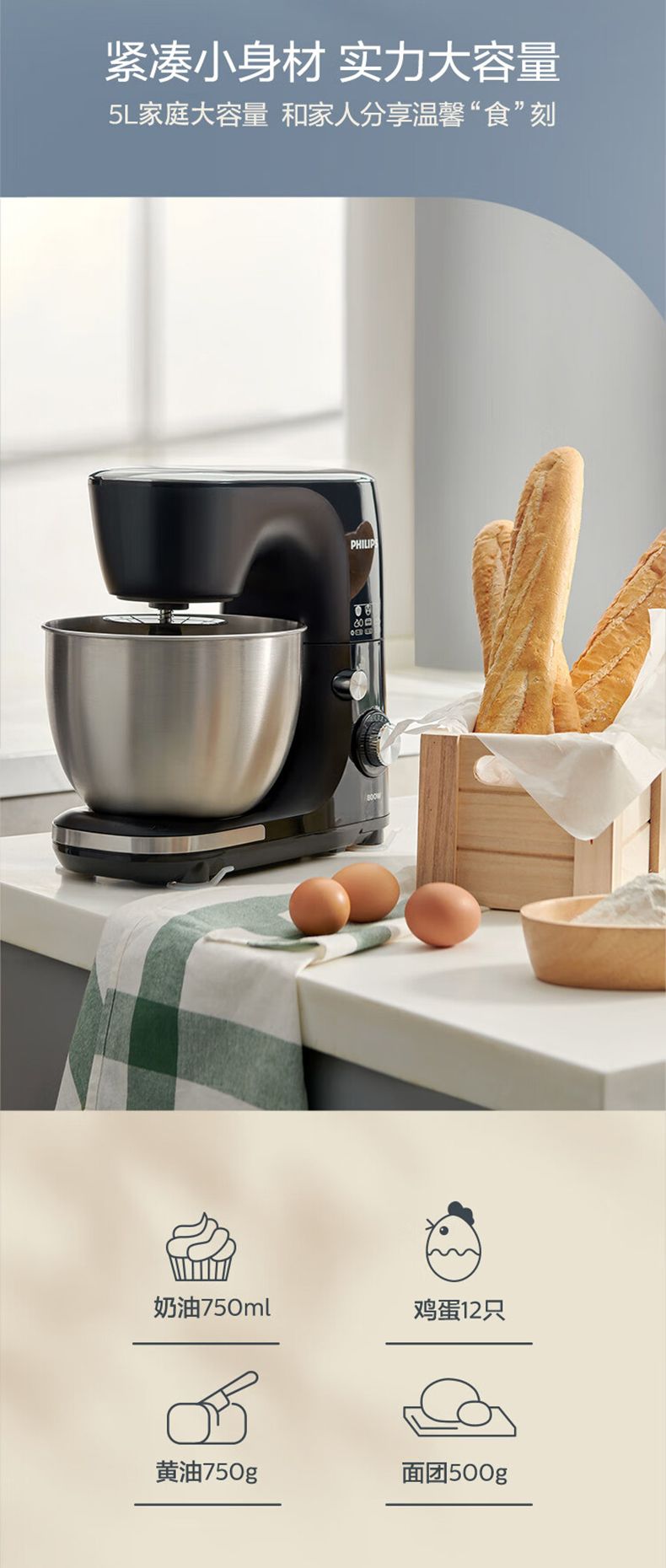 商品名称:飞利浦厨师机HR7922 家用多功能和面机台式小型揉面机全自动打蛋器5L大容量多档精准控速