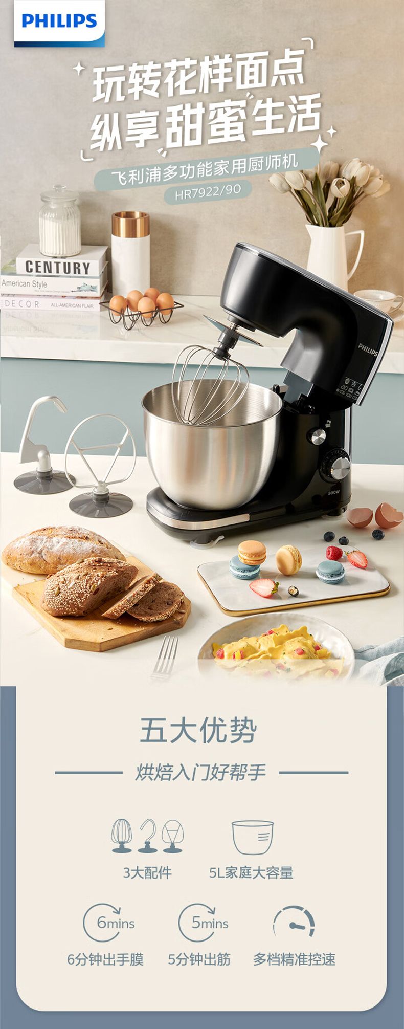 飞利浦厨师机HR7922 家用多功能和面机台式小型揉面机全自动打蛋器5L大容量多档精准控速