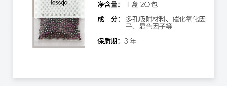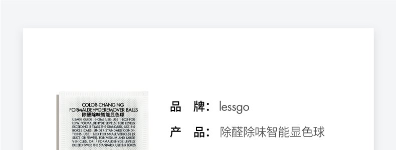商品名称:利事多(lessgo)除醛除味智能显色球 20包/盒 (2盒+赠甲醛检测盒*3)