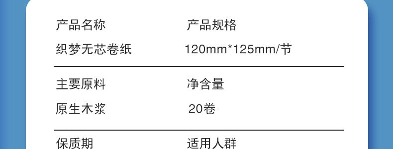 商品名称:织梦 家用卫生卷纸无芯卷纸 20卷/提