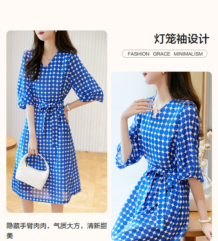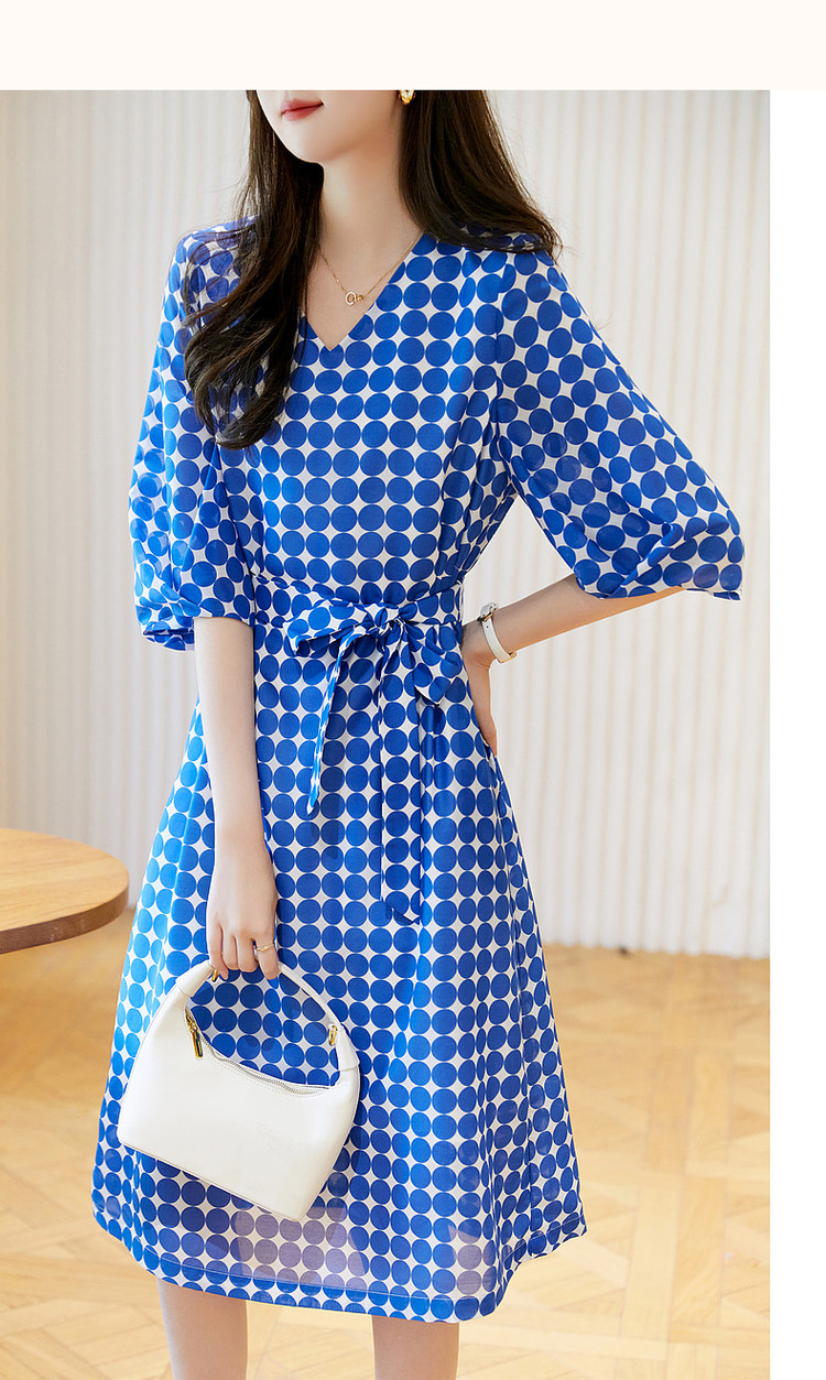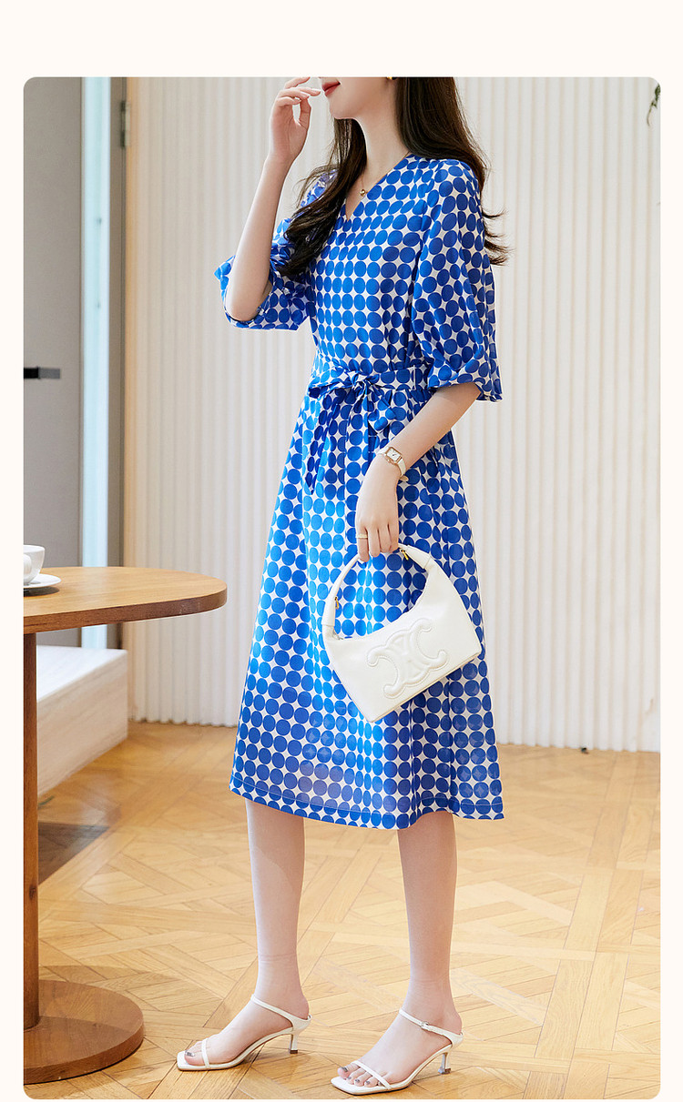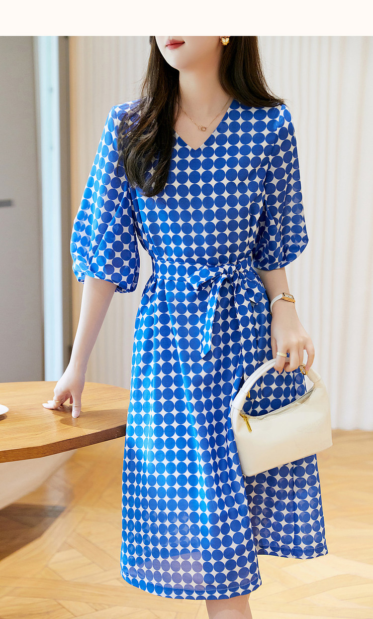 商品名称:【克莱因蓝】夏复古风V领波点灯笼袖雪纺小个子连衣裙女中长款 131521
