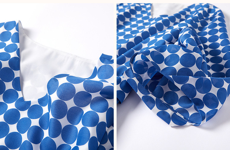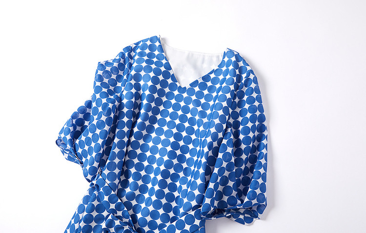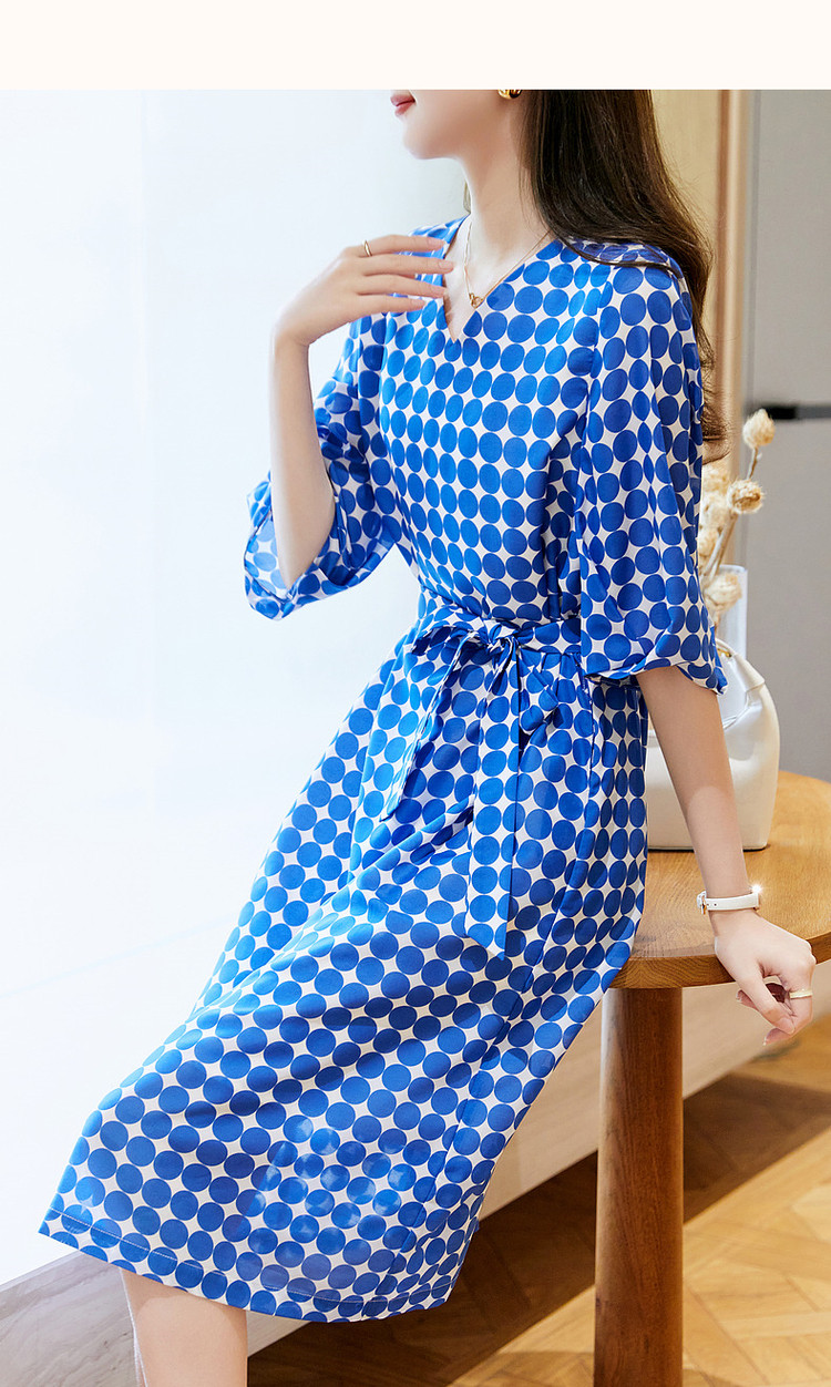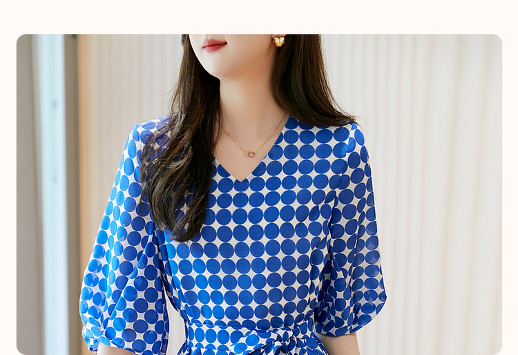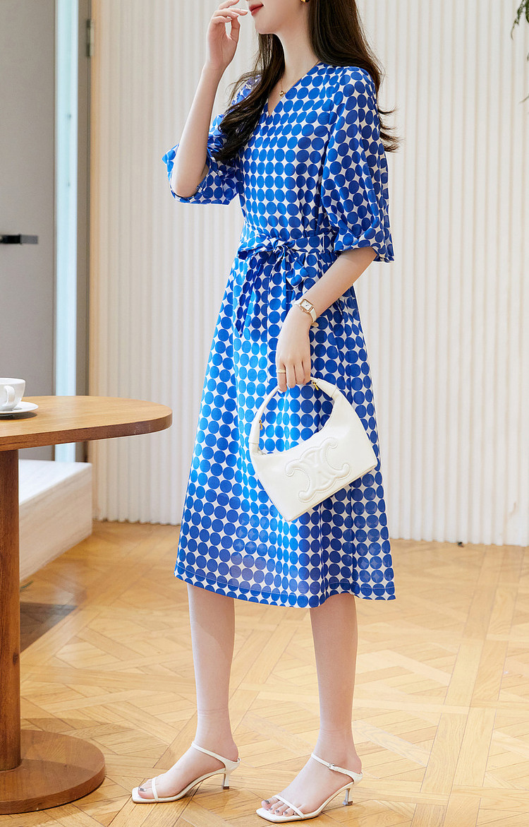 商品名称:【克莱因蓝】夏复古风V领波点灯笼袖雪纺小个子连衣裙女中长款 131521
