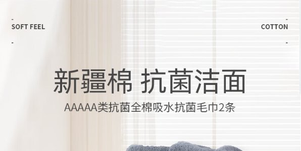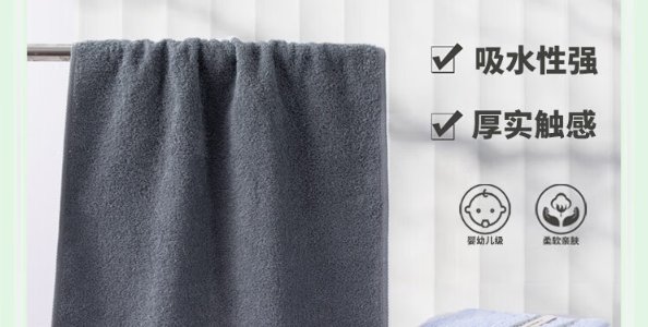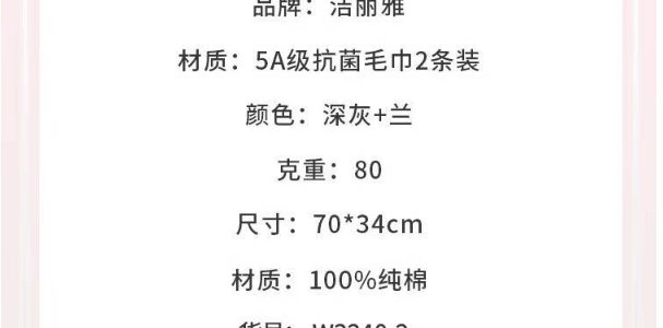 商品名称:洁丽雅(Grace)纯棉5A级抗菌毛巾 2条装 70*34cm 深灰+蓝色