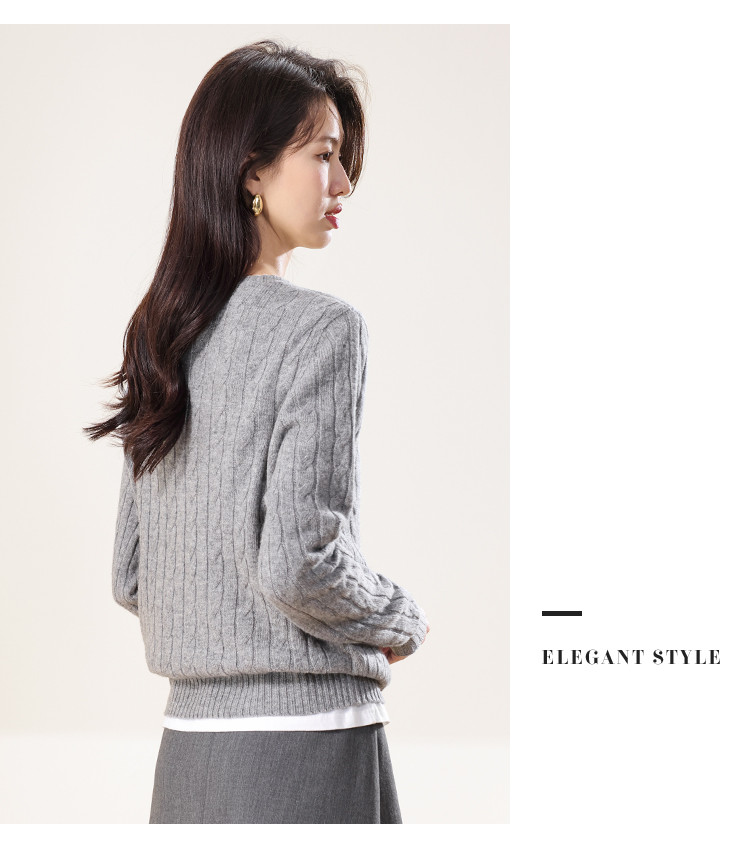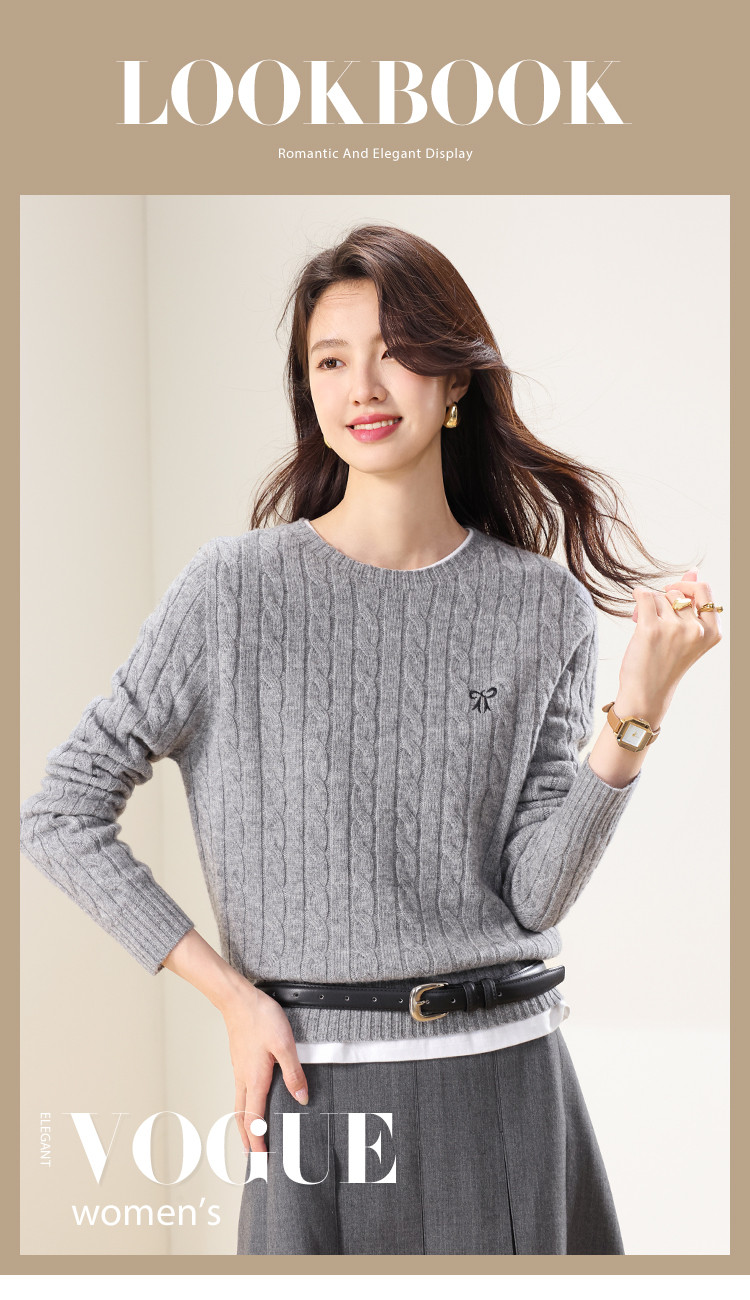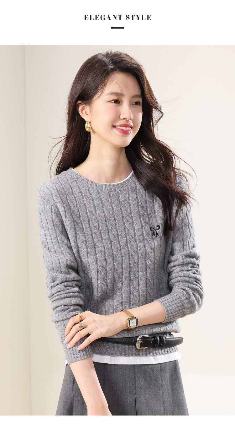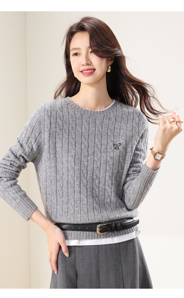 【100%绵羊毛】圆领纯色绞花羊毛针织打底衫春款毛衣 813651
