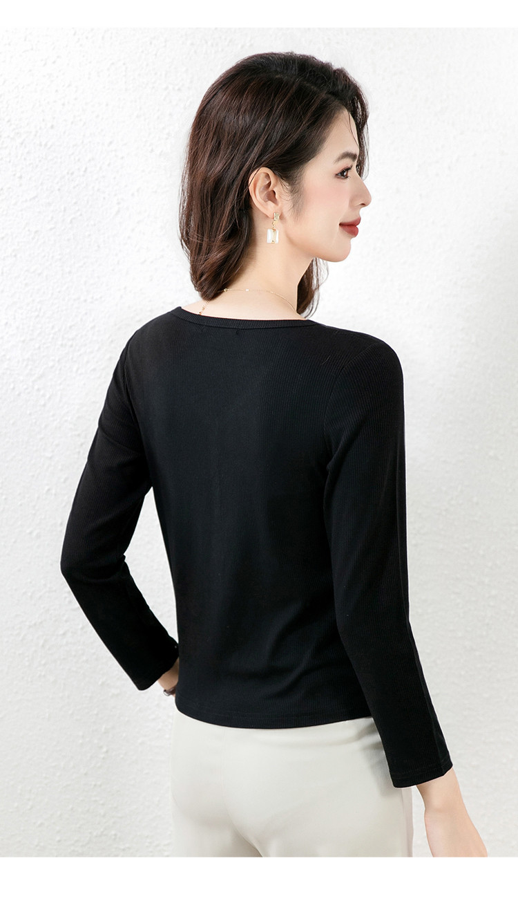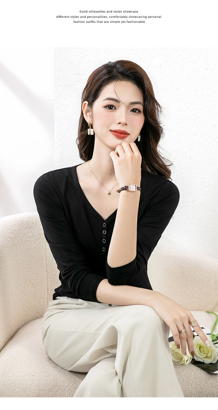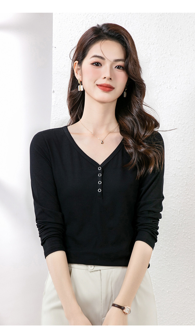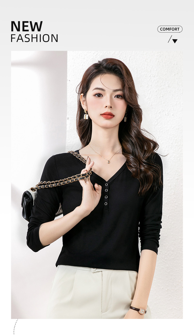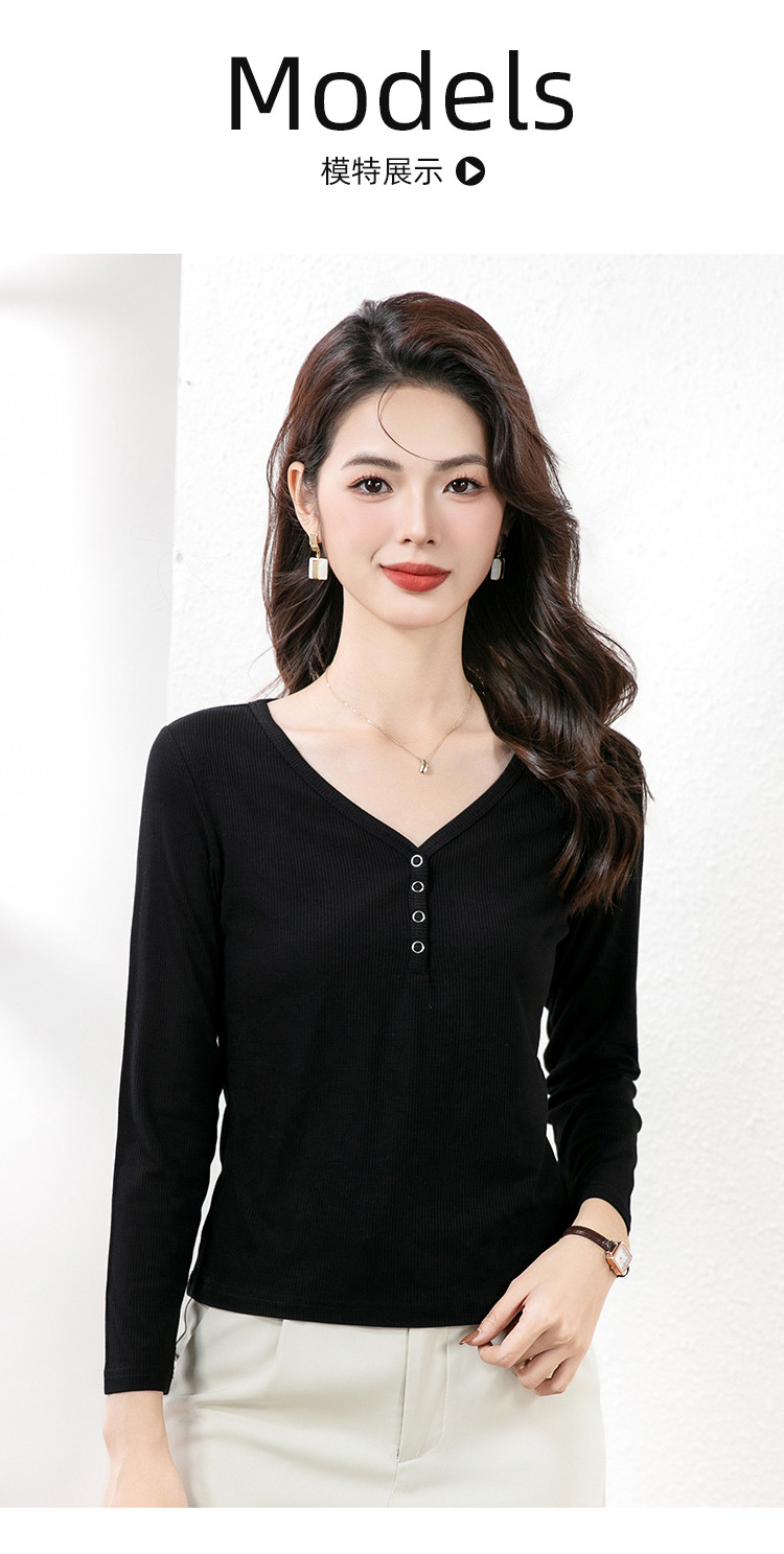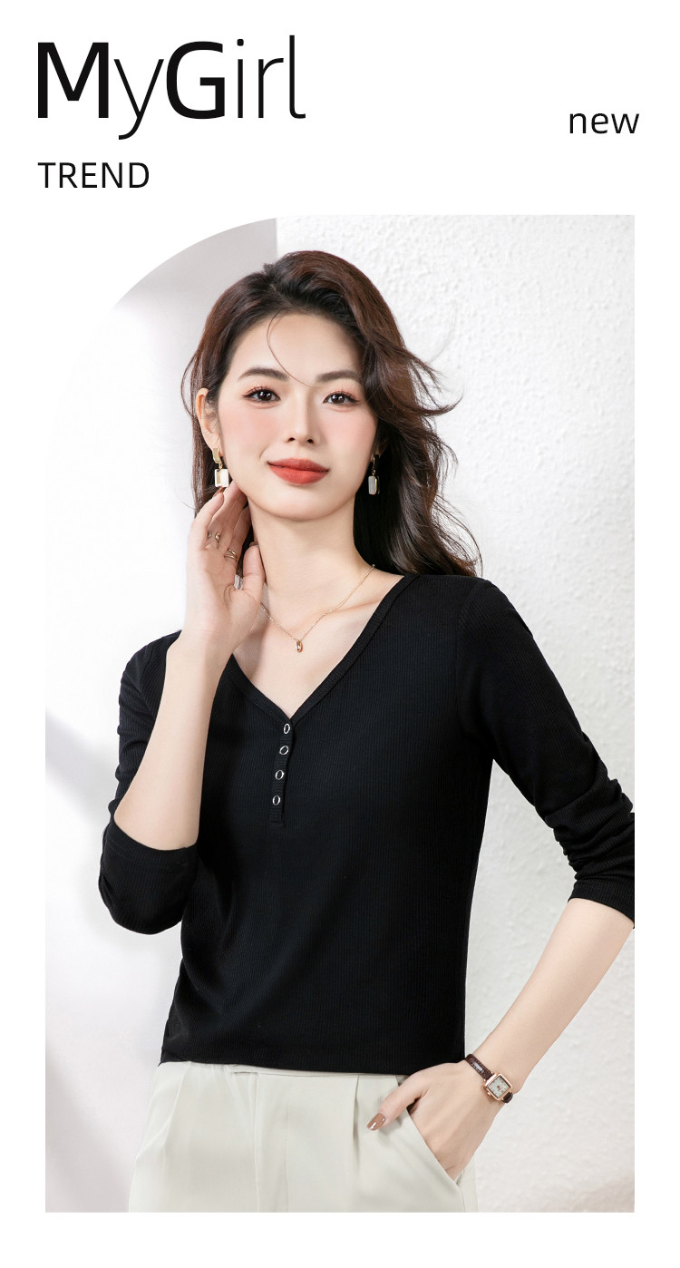 商品名称:休闲女士T恤纯色春秋显瘦V领上衣女休闲舒适长袖打底t恤女 857112