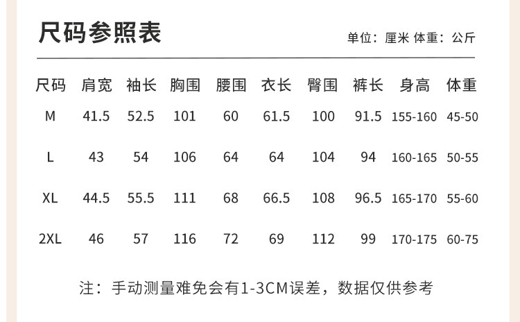 | 尺码 | 肩宽(cm) | 袖长(cm) | 衣长(cm) | 身高(cm) | 腰围(cm) | 裤长(cm) | 体重(kg) | 臀围(cm) | 胸围(cm) | 号型 |