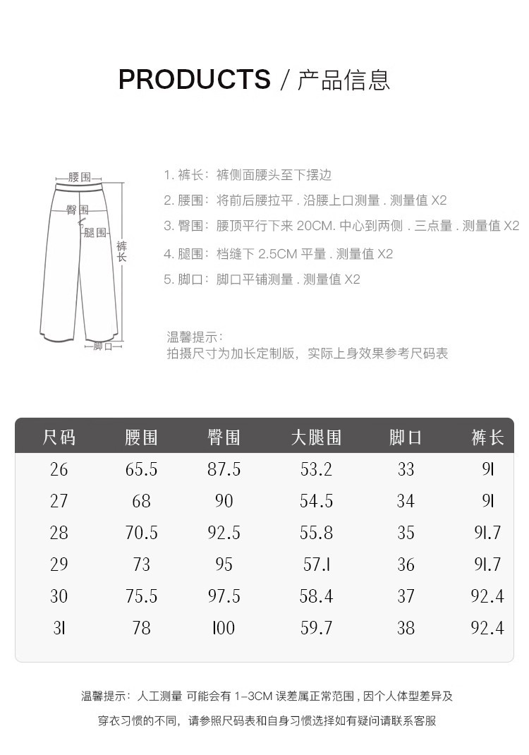| 尺码 | 大腿围(cm) | 裤脚围(cm) | 前浪(cm) | 后浪(cm) | 腰围(cm) | 裤长(cm) | 膝围(cm) | 臀围(cm) | 号型 |
