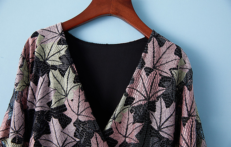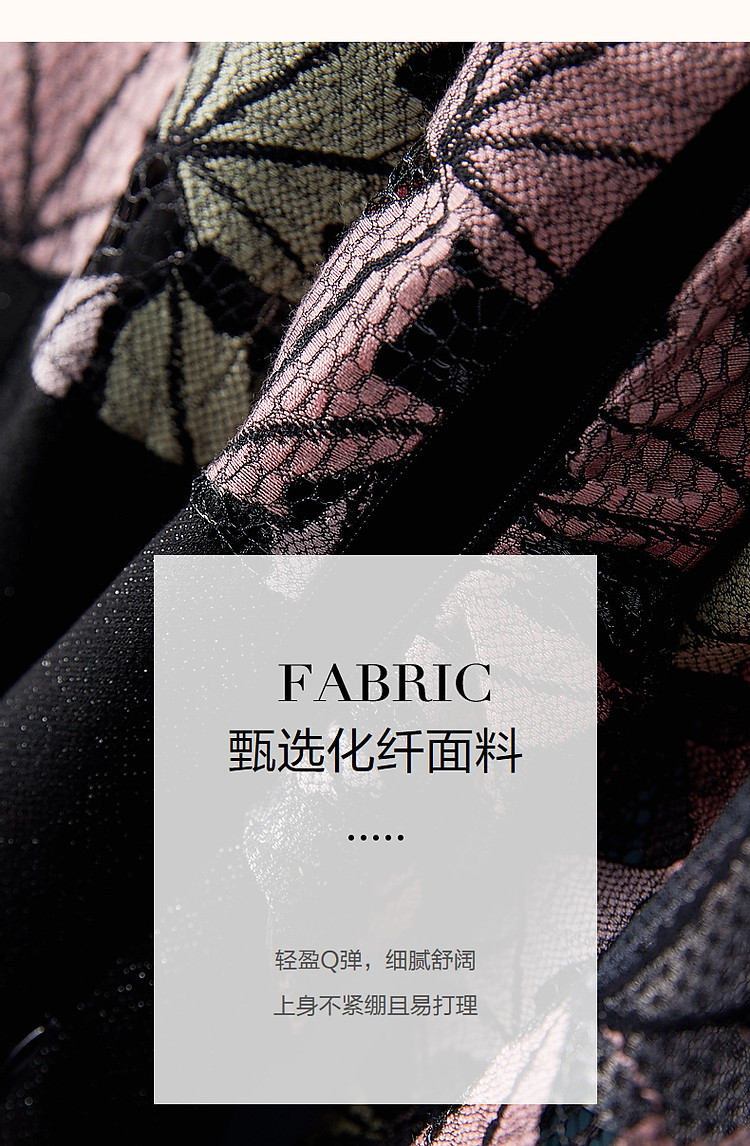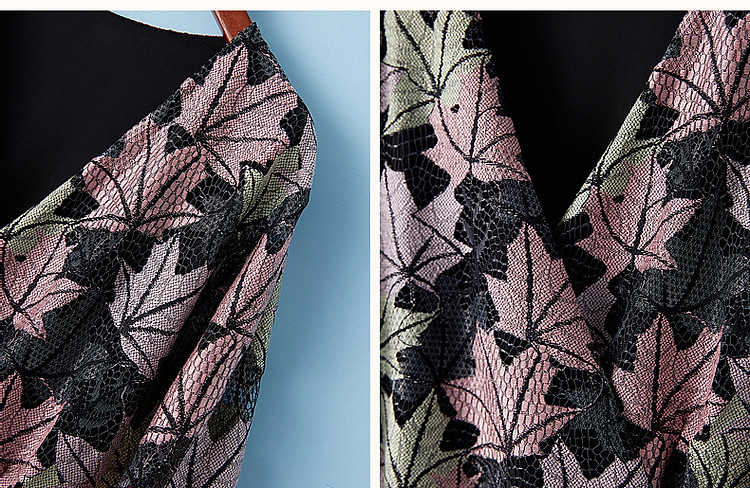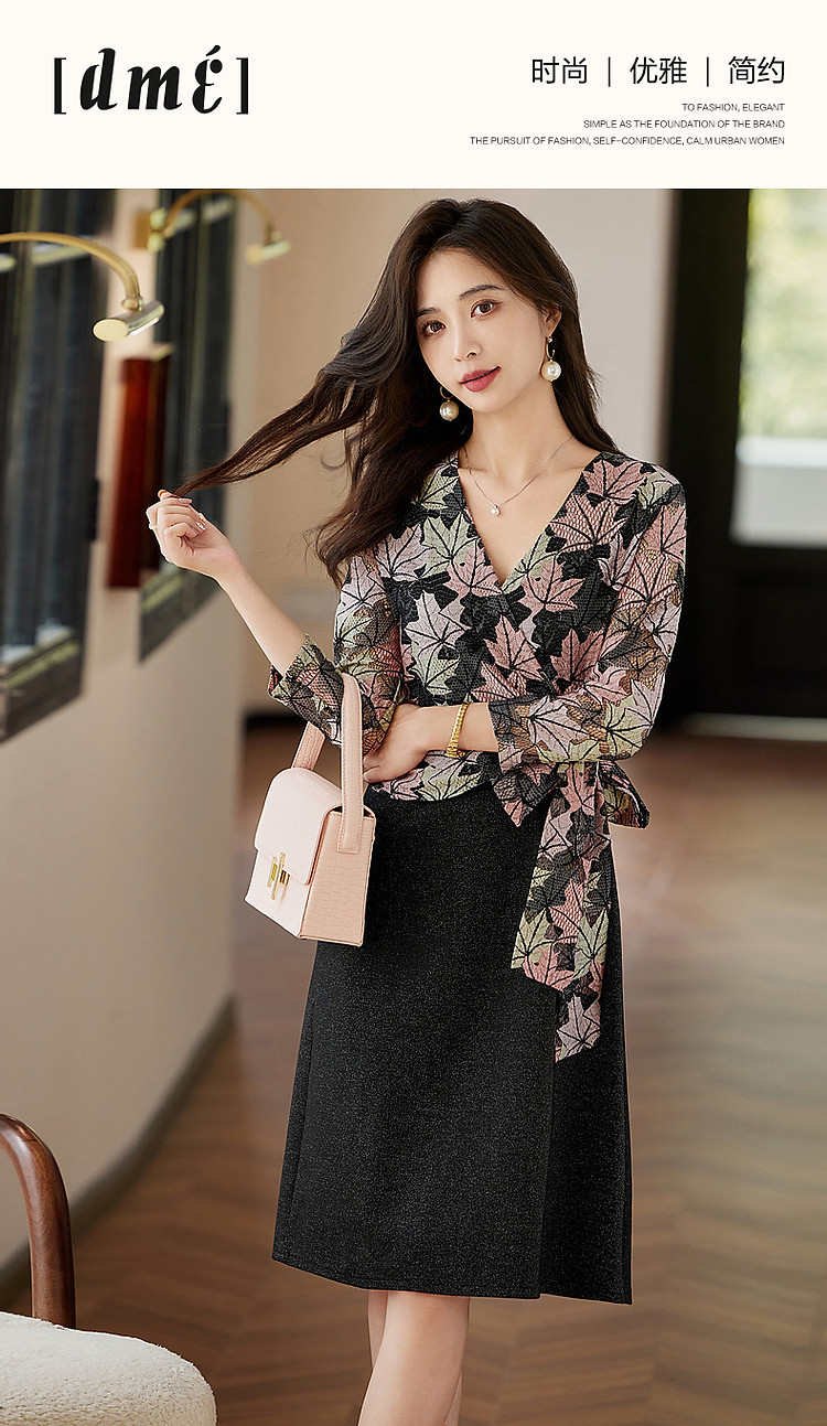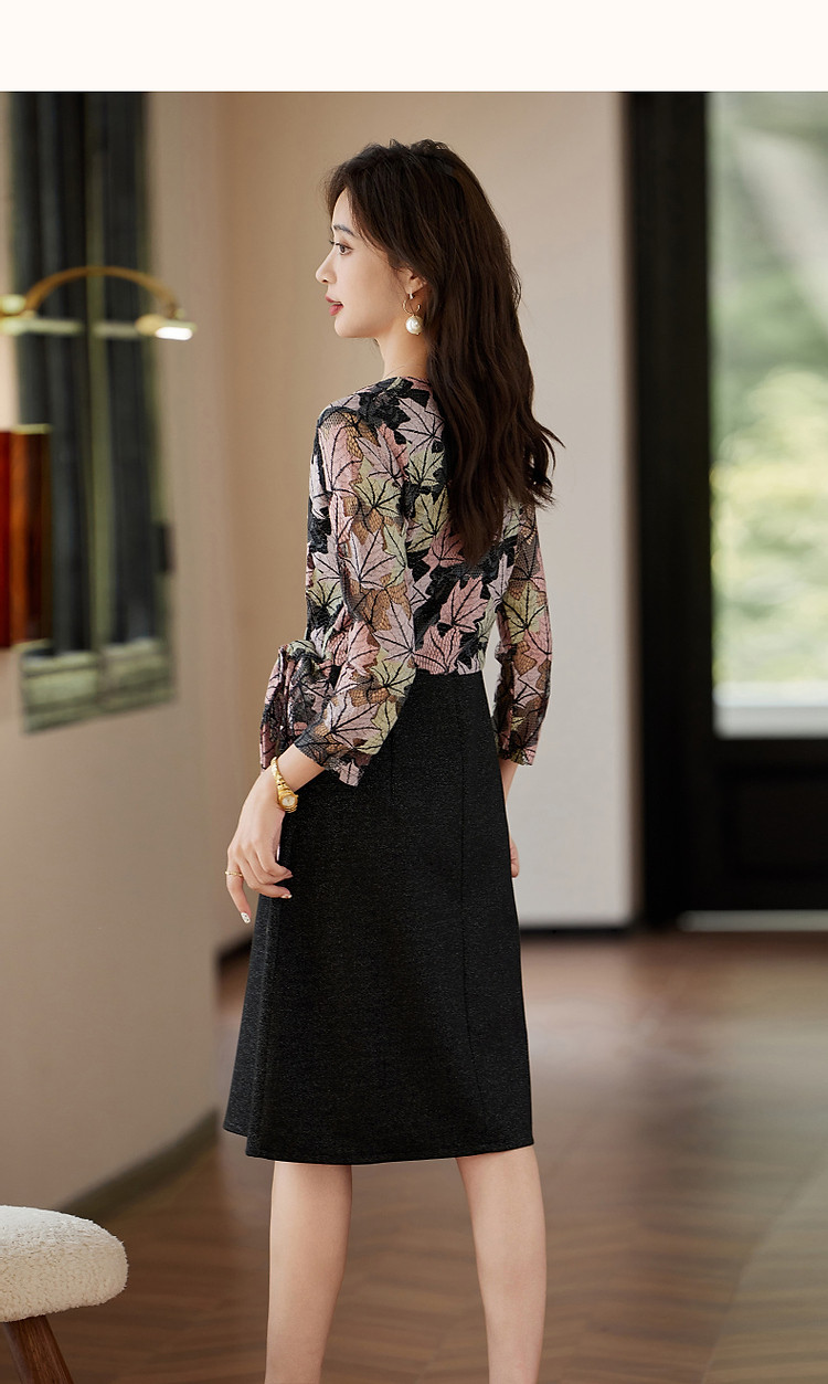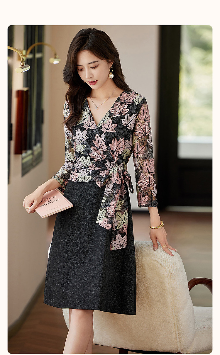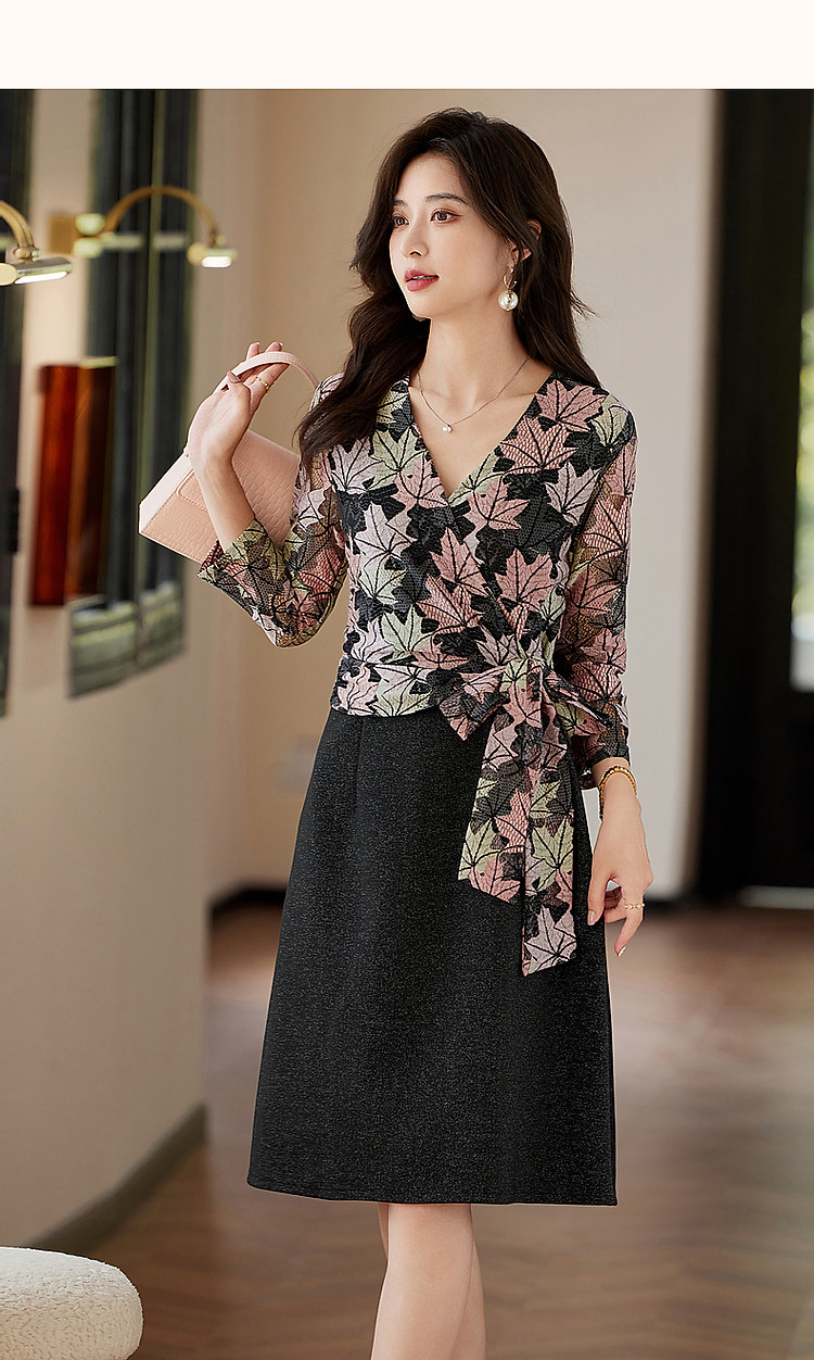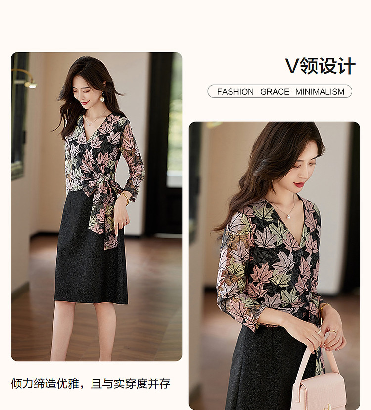 商品名称:【办公室OOTD】秋季静奢温柔树叶V领系带九分袖A字连衣裙女 387713