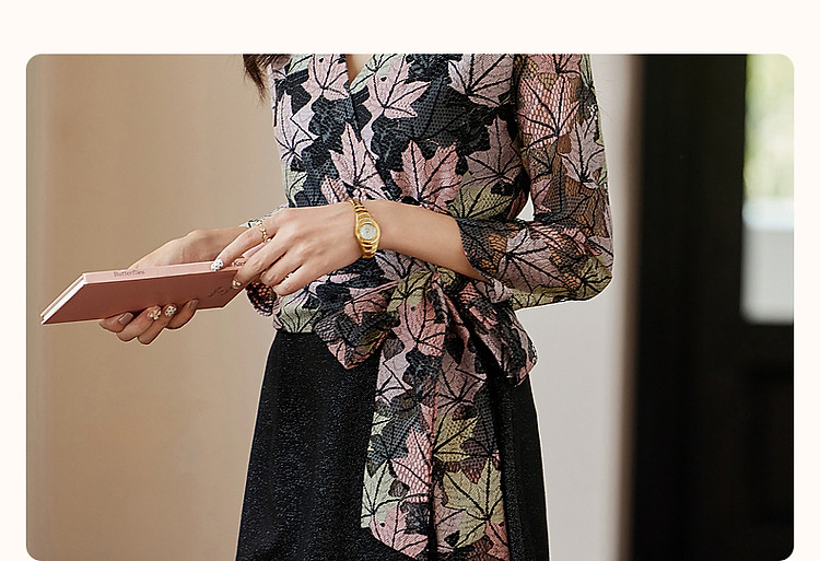 【办公室OOTD】秋季静奢温柔树叶V领系带九分袖A字连衣裙女 387713