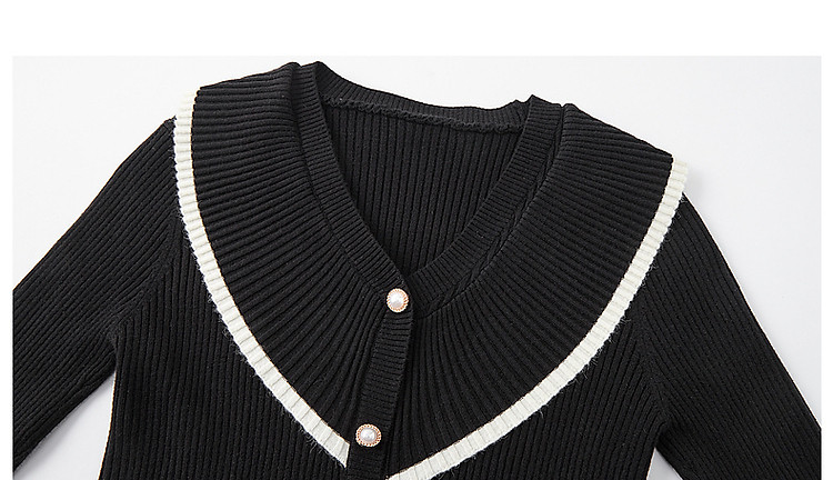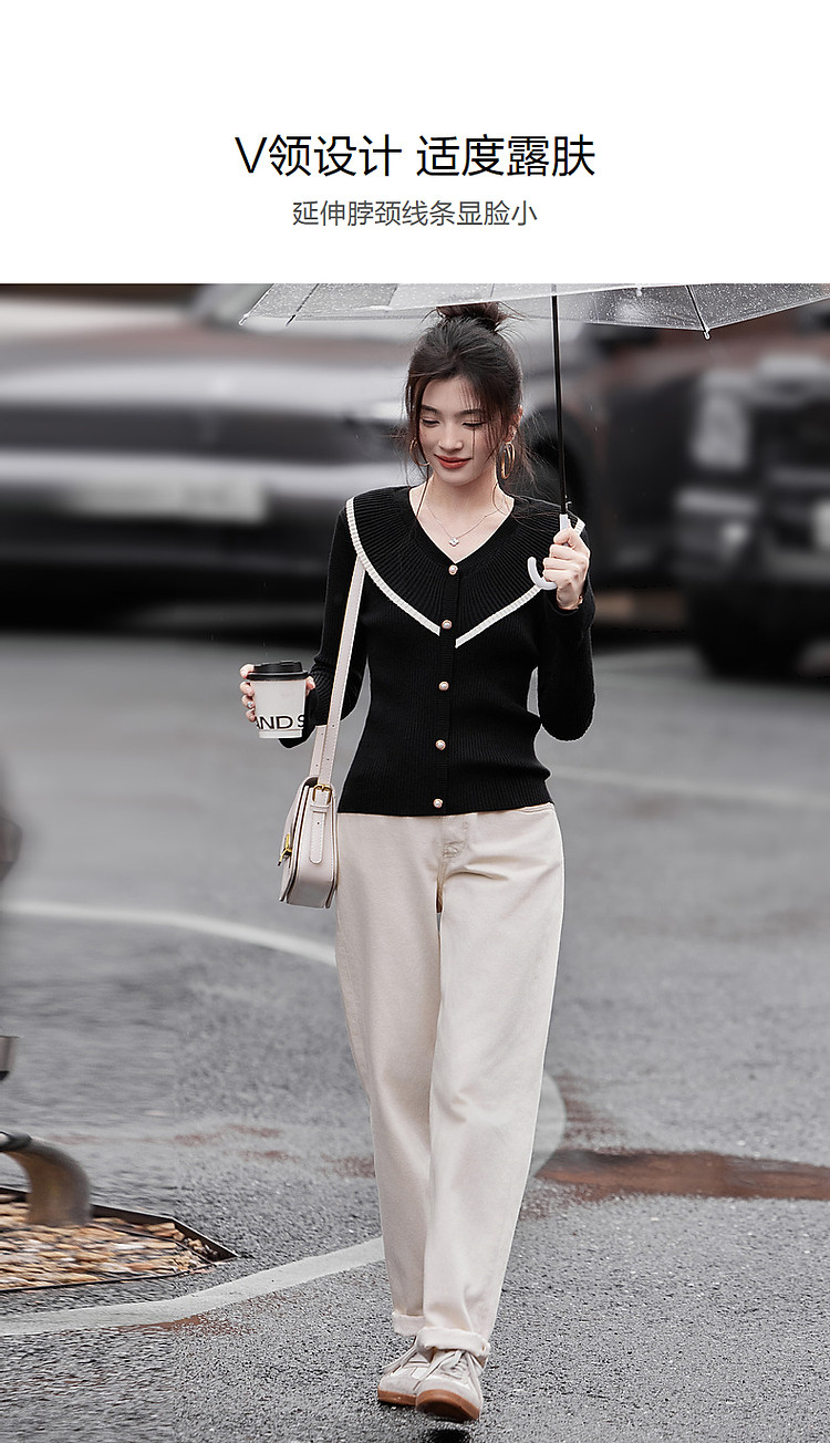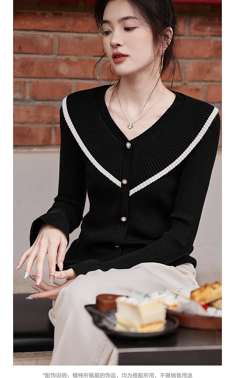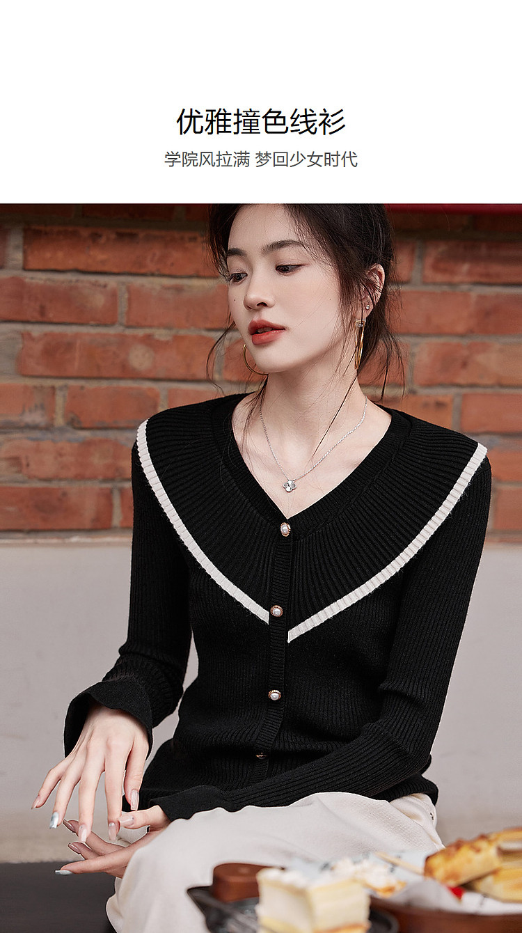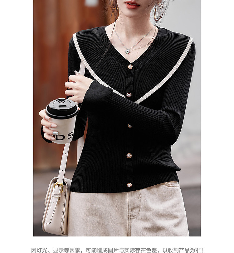 商品名称:【法式风情】春秋V领纤绒纱荷叶边撞色开衫木耳边针织衫女上衣 111425