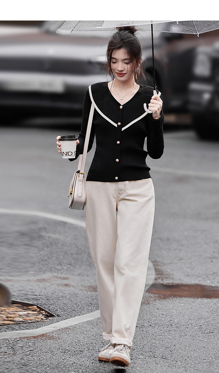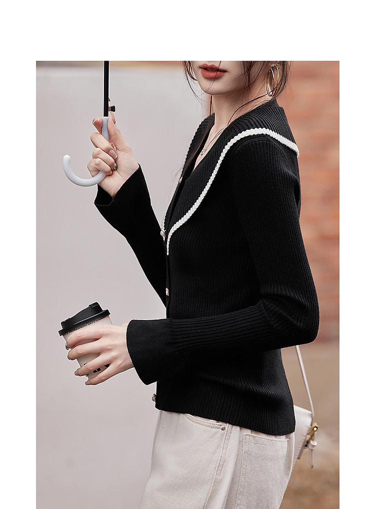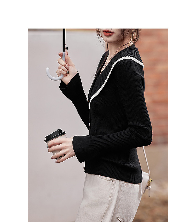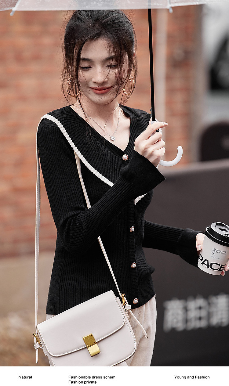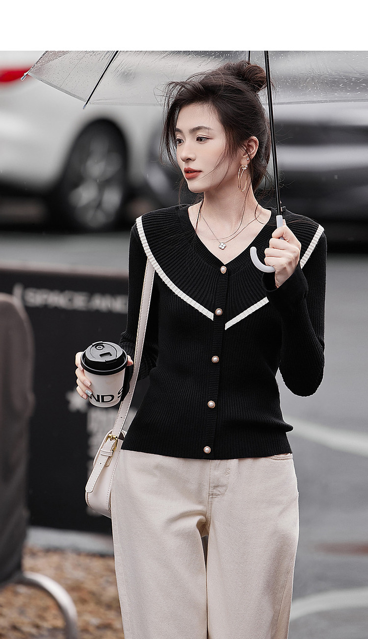 商品名称:【法式风情】春秋V领纤绒纱荷叶边撞色开衫木耳边针织衫女上衣 111425
