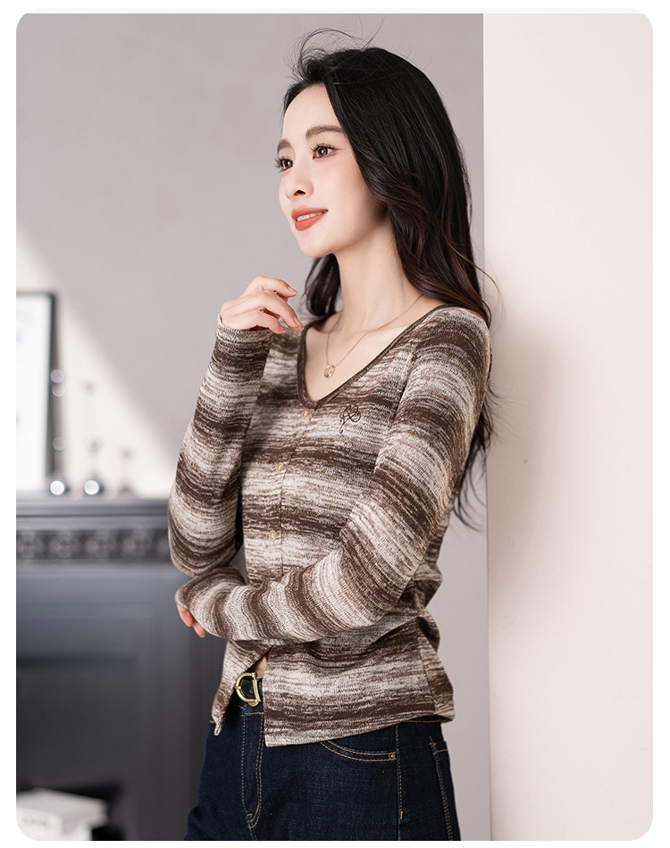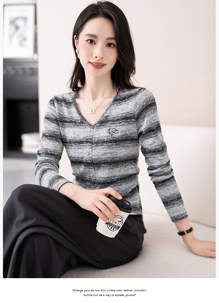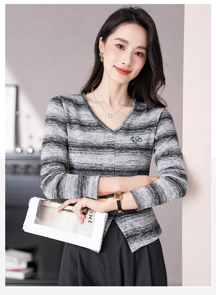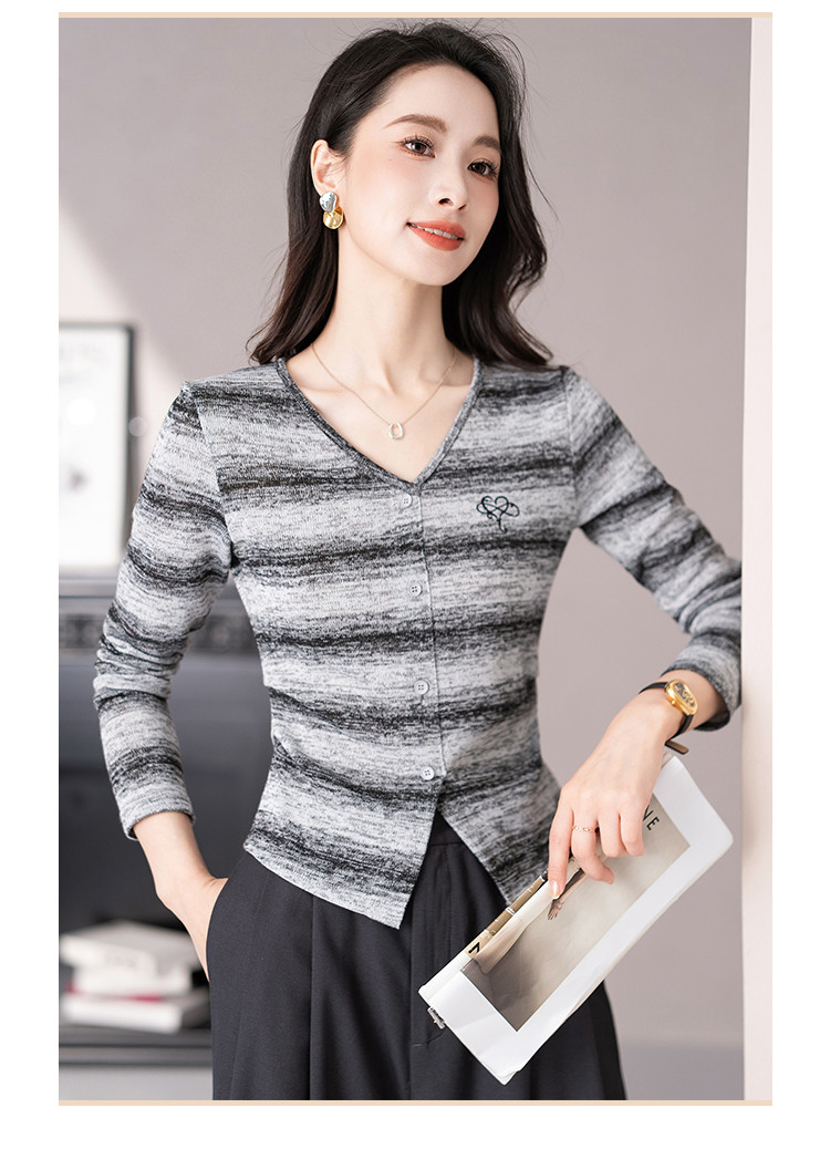 春秋潮款精美刺绣V领长袖T恤女褶皱松紧设计单排扣装饰修身上衣 784769