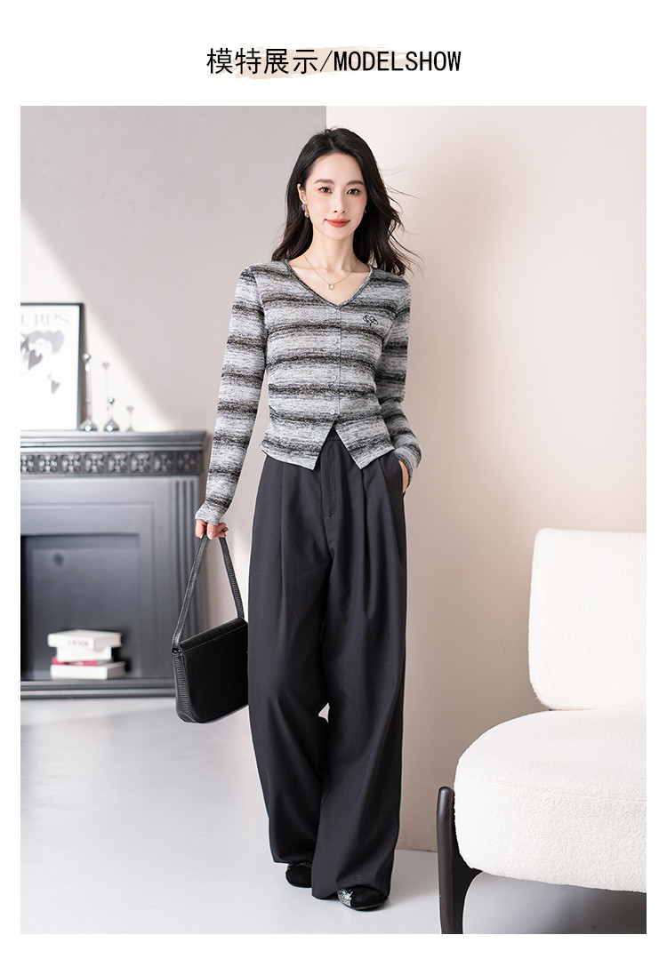 商品名称:春秋潮款精美刺绣V领长袖T恤女褶皱松紧设计单排扣装饰修身上衣 784769