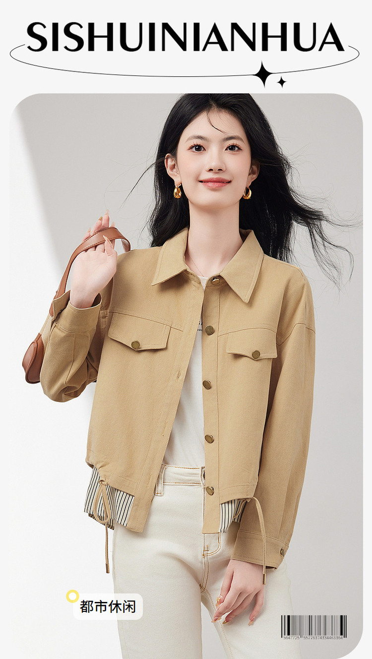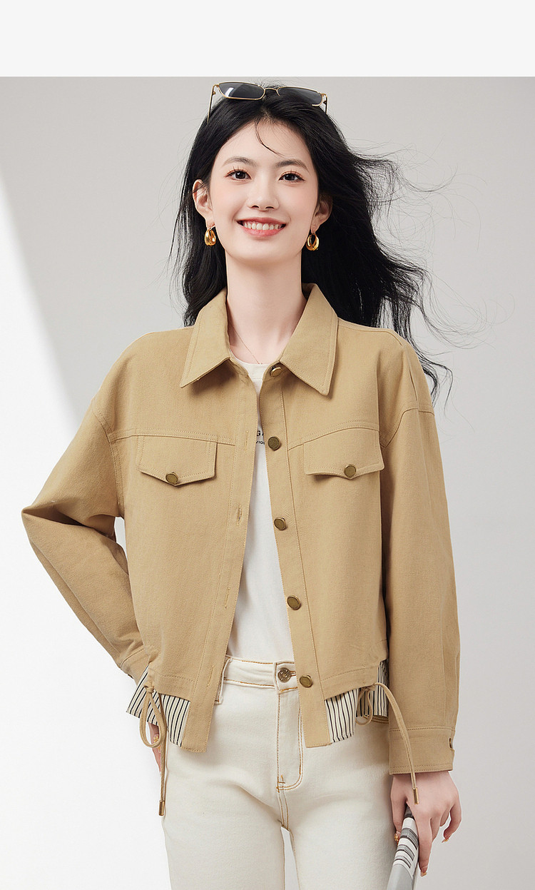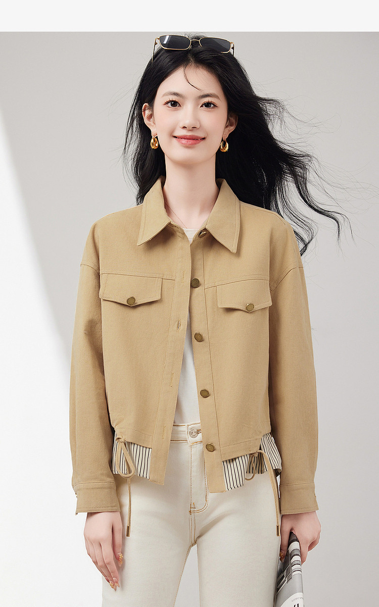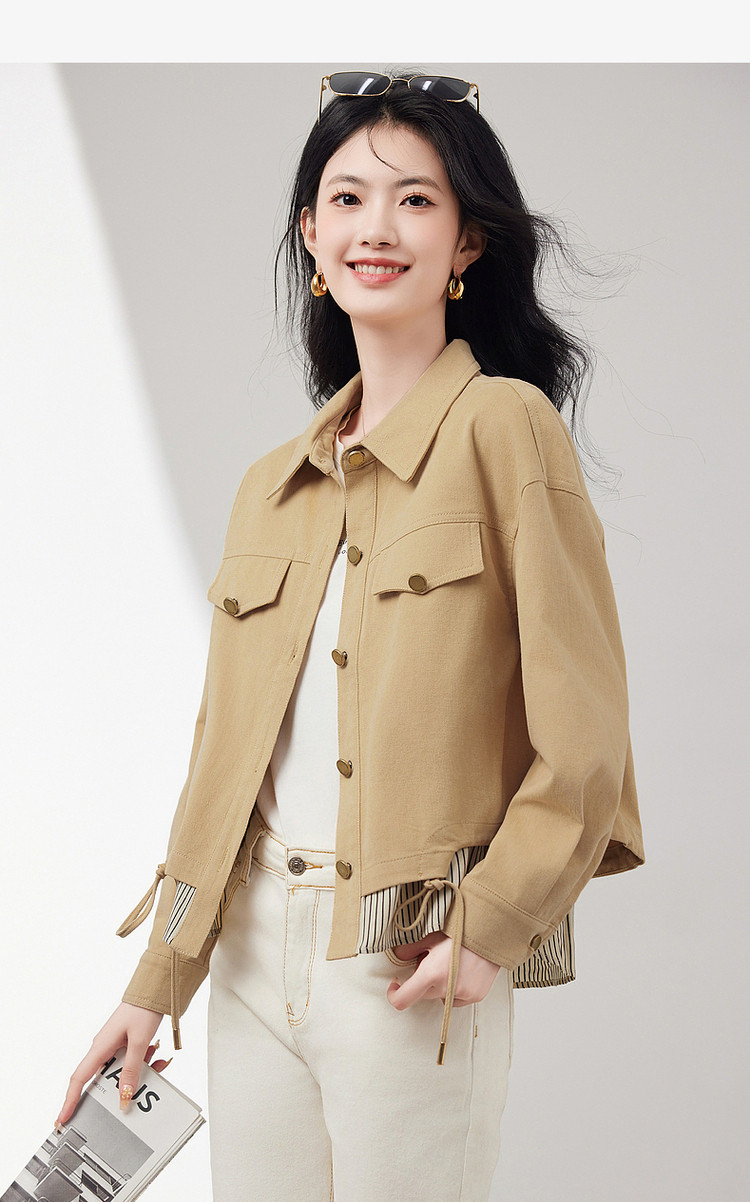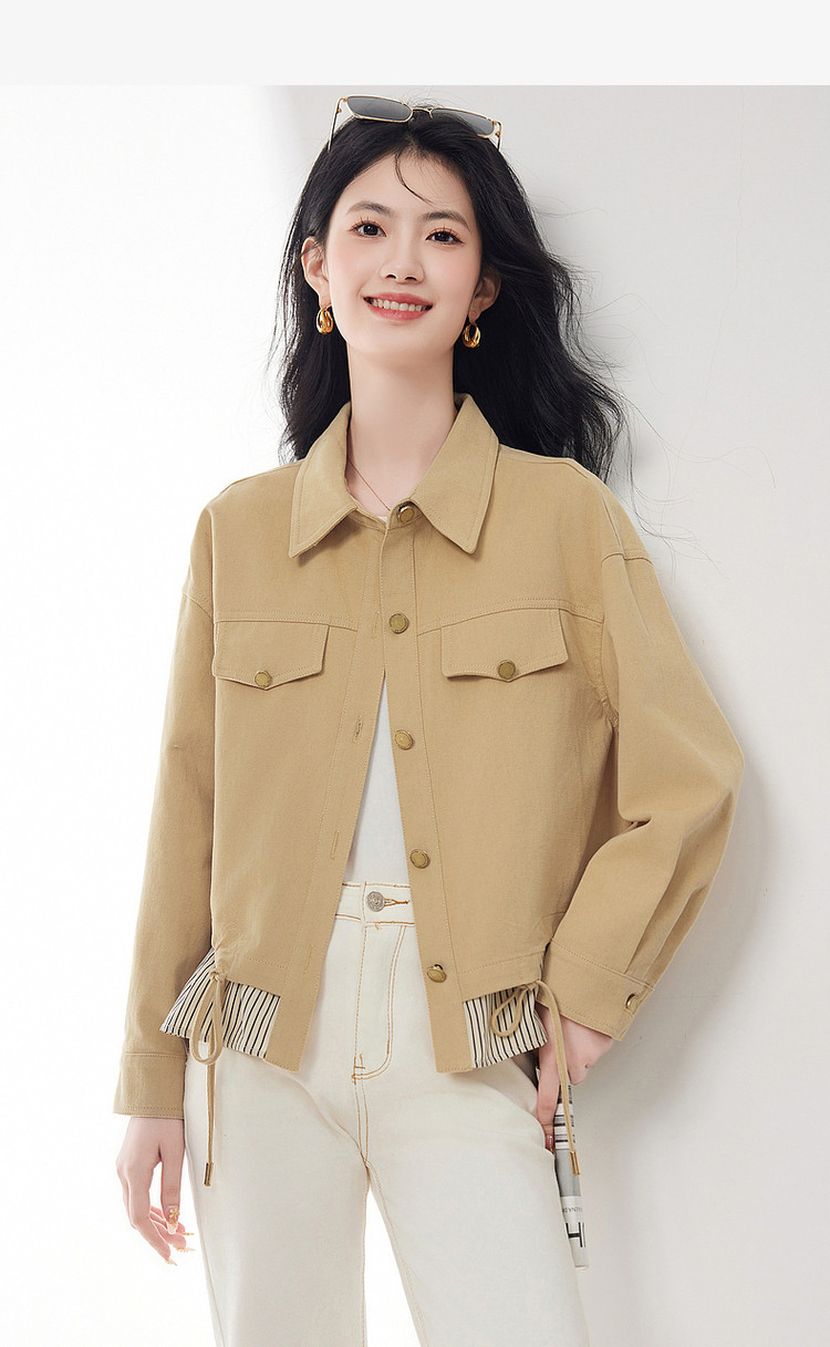 商品名称:短款牛仔外套假两件春春小个子抽绳收腰休闲条纹拼接百搭上衣 701400