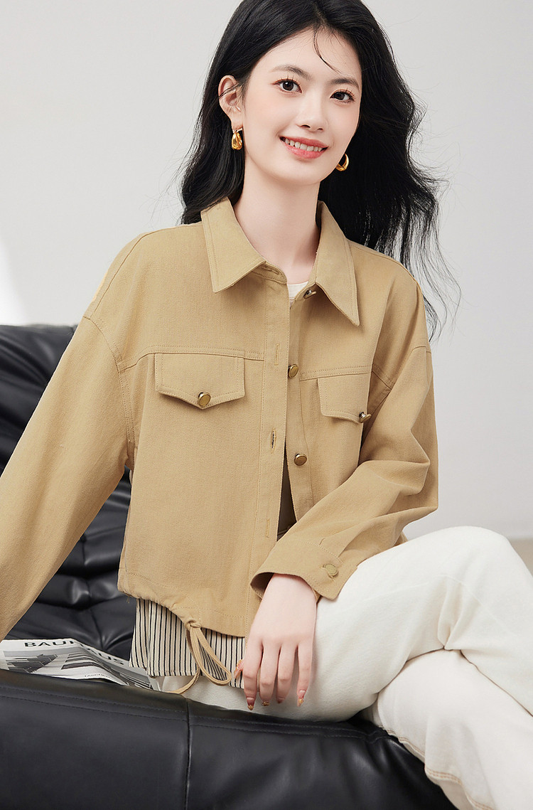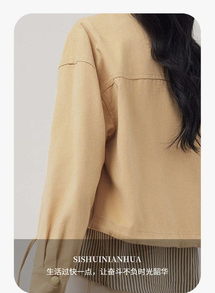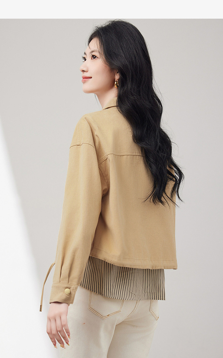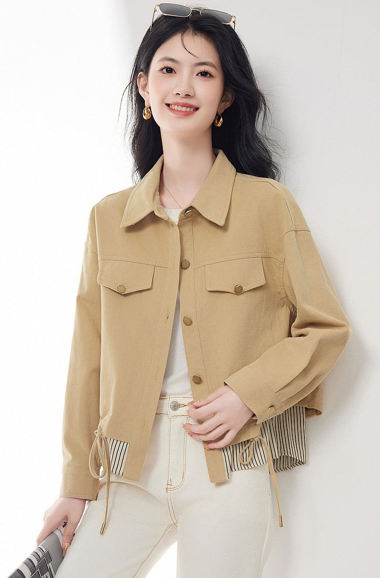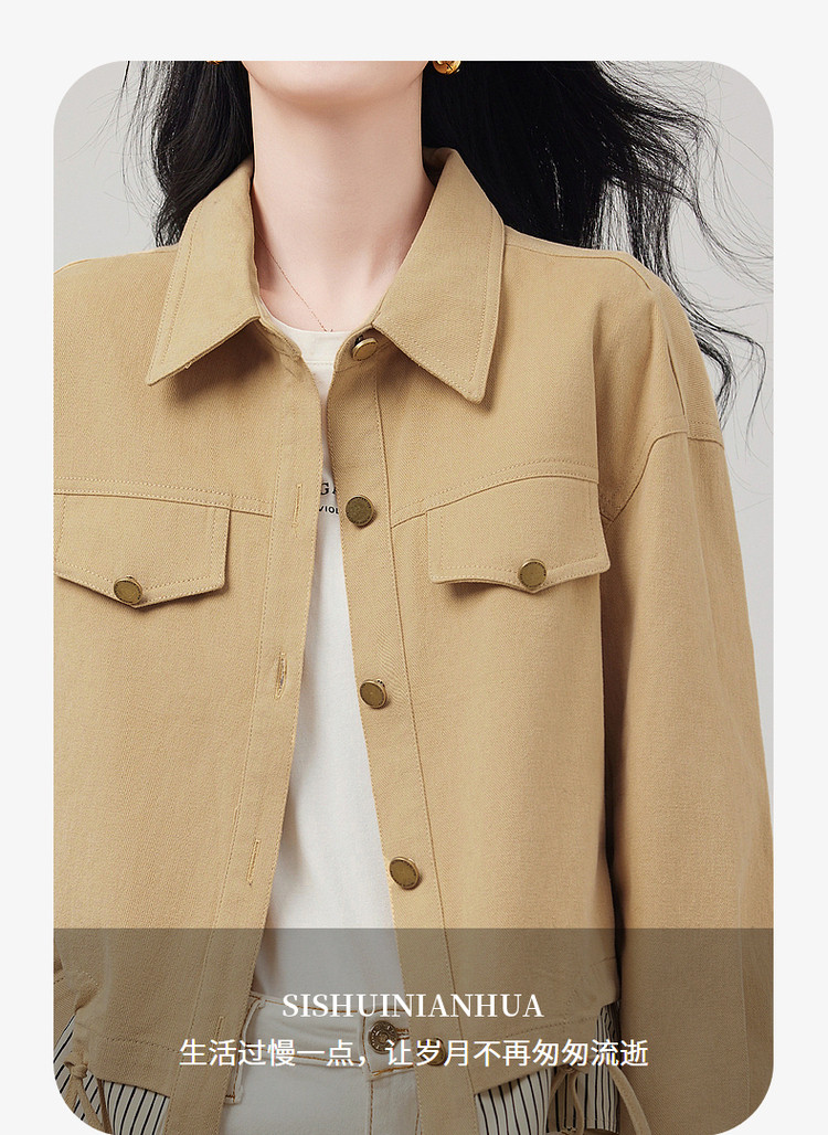商品名称:短款牛仔外套假两件春春小个子抽绳收腰休闲条纹拼接百搭上衣 701400