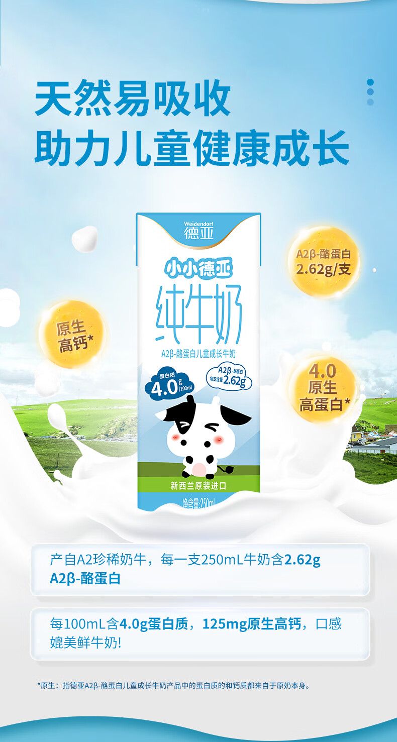 商品名称:新西兰原装进口 德亚A2β-酪蛋白儿童牛奶礼盒250ML*10 高蛋白 易吸收