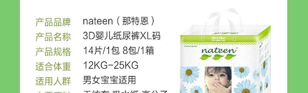 商品名称:比利时 那特恩(nateen)清风系列纸尿裤 XL14片(12-25kg)