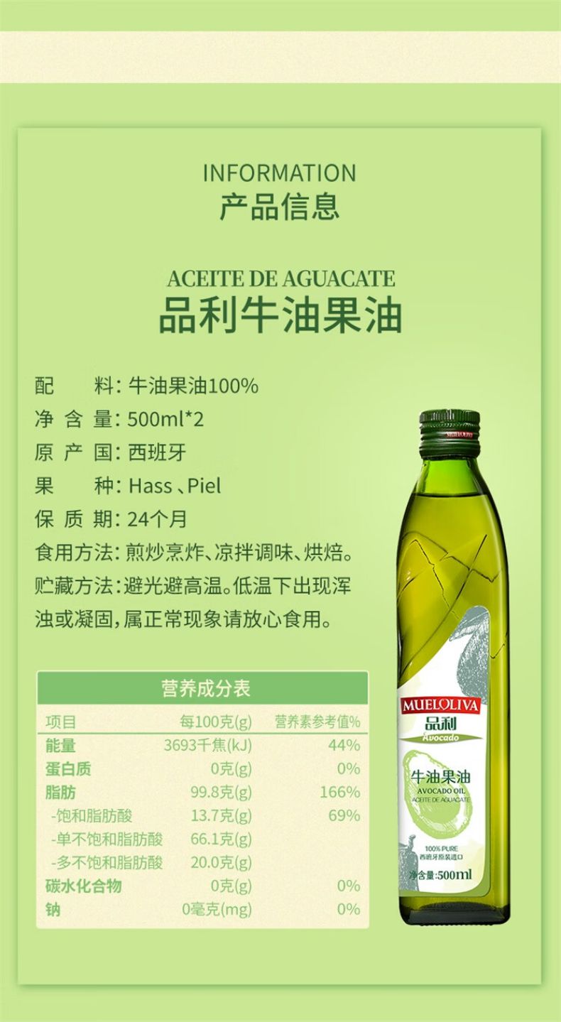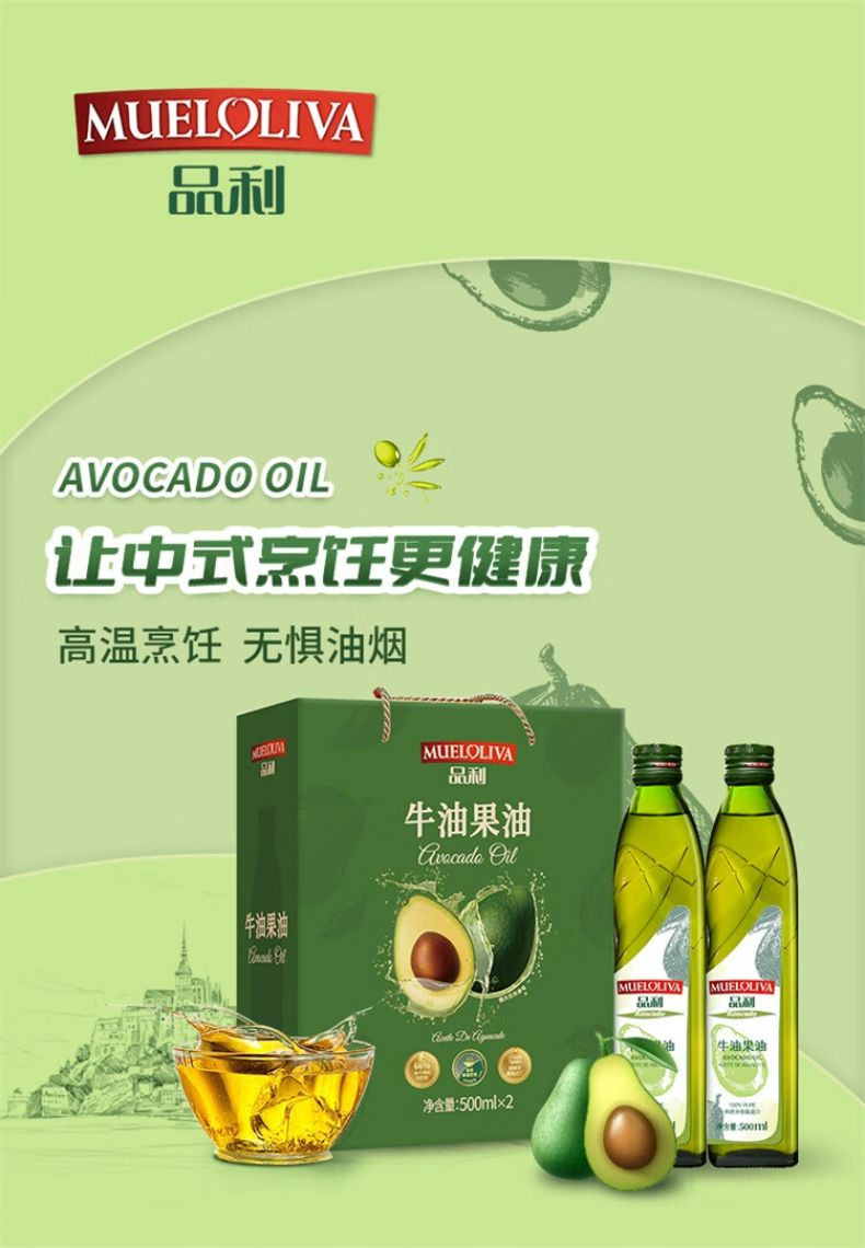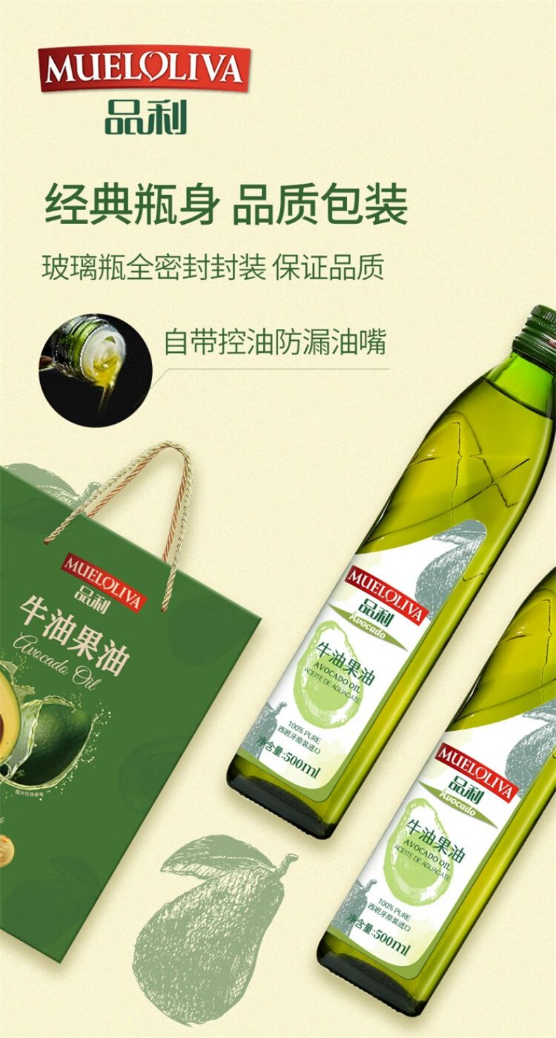 商品名称:品利牛油果油500ml*2瓶礼盒装 鳄梨油食用油家用热炒凉拌西班牙进口 牛油果油